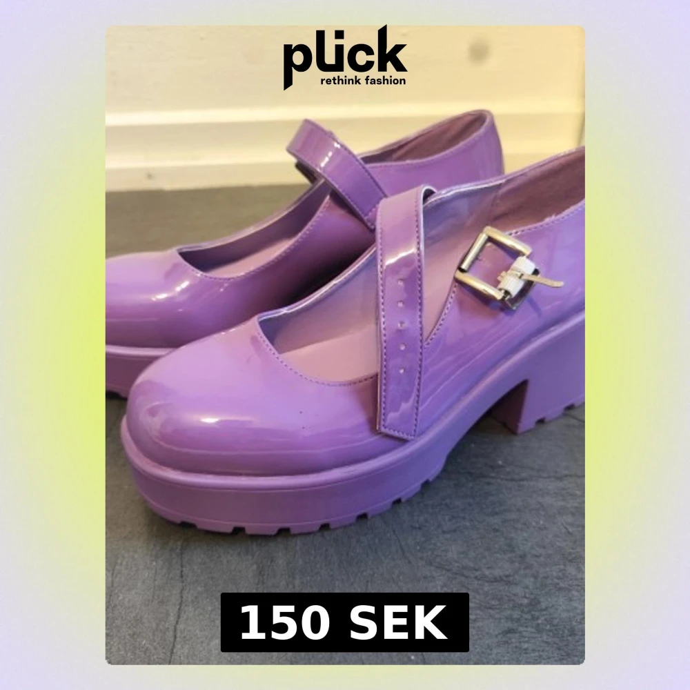 Säljer ett par lila Mary Jane pumps från Koi Footwear med chunky plattform och bred klack. Skorna har en glansig finish, rund tå och justerbart spänne i silver. Tillverkade i syntetmaterial och har en rejäl sula med grovt mönster för extra attityd. Använda ca två gånger