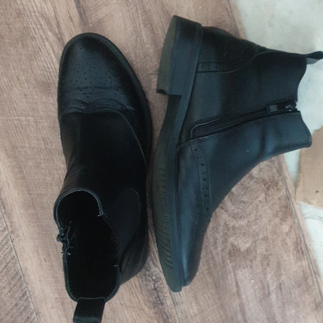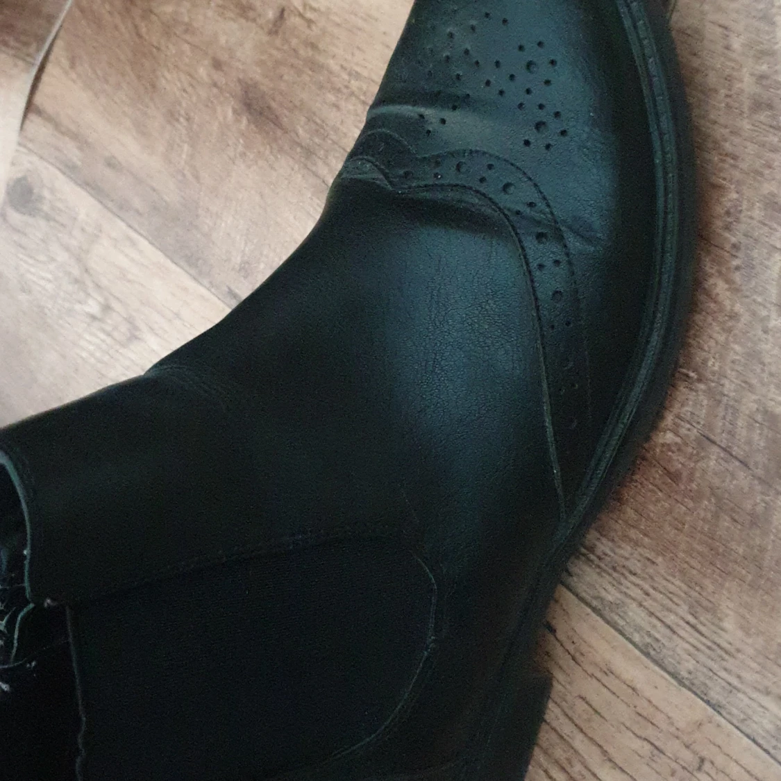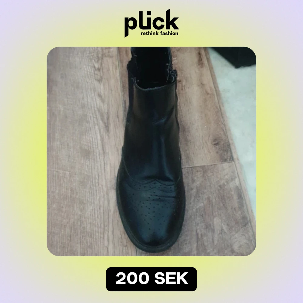 Säljer ett par snygga svarta stövletter i skinn. De har en stilren design med perforerade detaljer på tån och en praktisk dragkedja på sidan för enkel på- och avtagning. Perfekta för både vardag och fest!