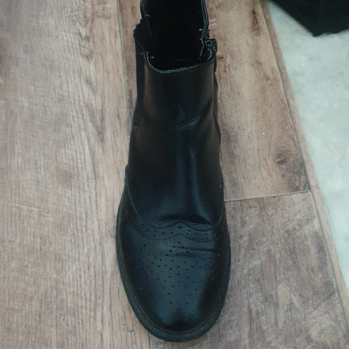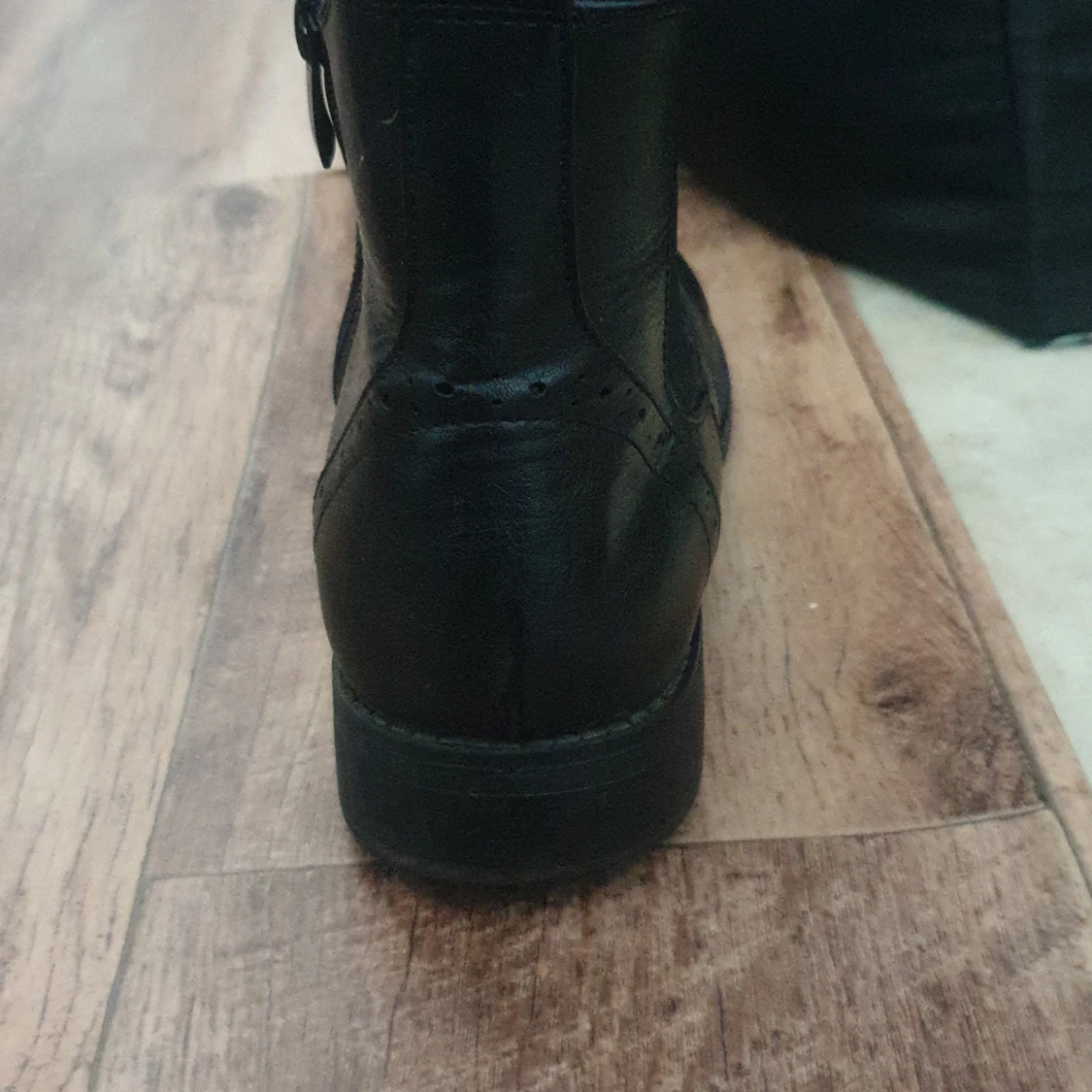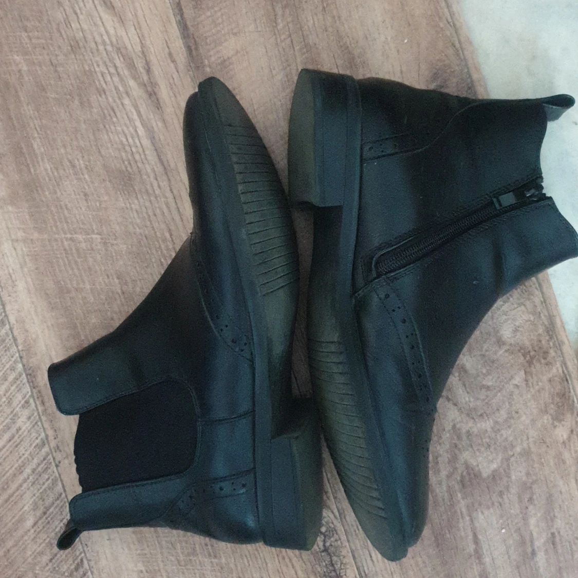 Säljer ett par snygga svarta stövletter i skinn. De har en stilren design med perforerade detaljer på tån och en praktisk dragkedja på sidan för enkel på- och avtagning. Perfekta för både vardag och fest!
