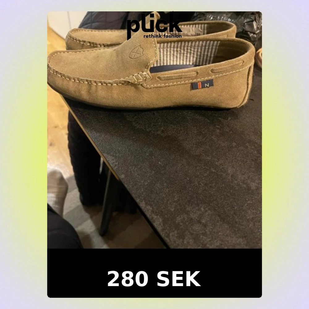 Säljer ett par beige loafers i mocka med rund tå och platt sula. Skorna har dekorativa sömmar runt ovansidan och en liten tygdetalj med ränder på sidan. Insidan är fodrad med randigt tyg och hälen har en förstärkt gummidetalj.