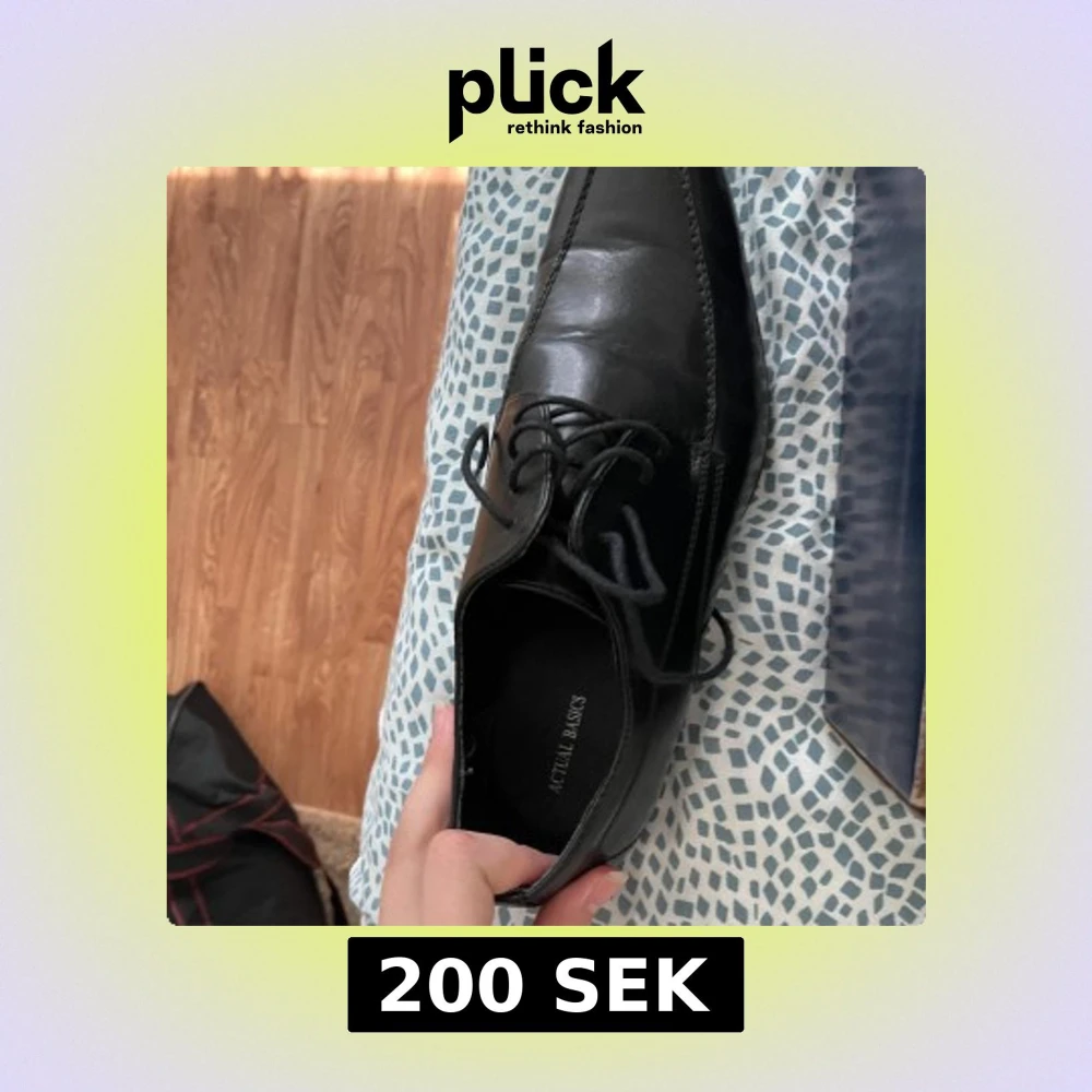 Säljer ett par svarta finskor från Actual Basics med snörning och spetsig tå. Skorna har en elegant design med slät ovandel i skinnimitation och platt sula. Perfekta för en dressad look.