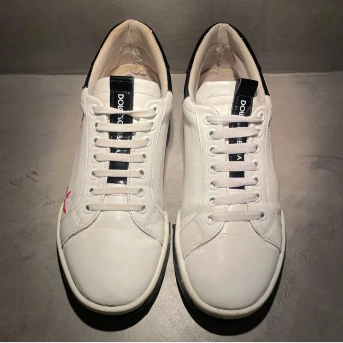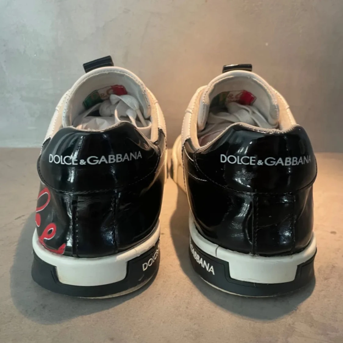 Stilrena vita sneakers från Dolce & Gabbana med svart och röd detaljering. Skorna har sprickor har kvitto och är köpta från sneakerstv. har du några frågor ställ de!