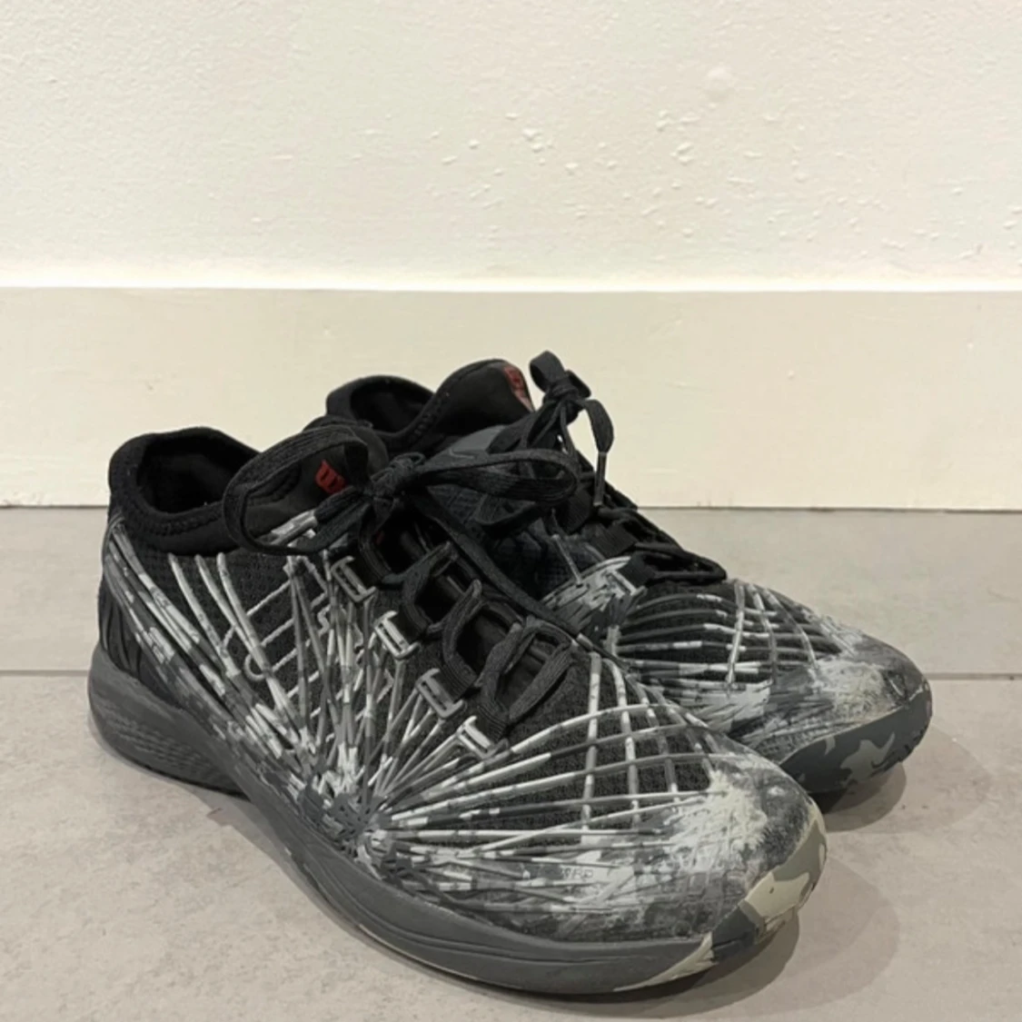 Snygga tennisskor från Wilson i svart och grått med ett unikt mönster. Skorna har snörning och en slitstark sula perfekt för tennisbanan. Perfekta för dig som vill ha både stil och funktion på banan.