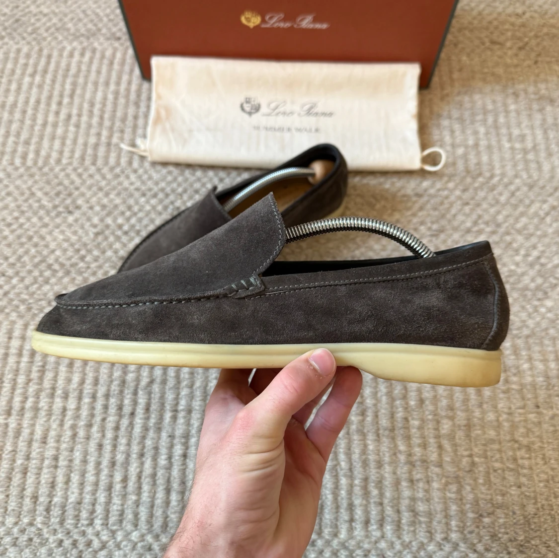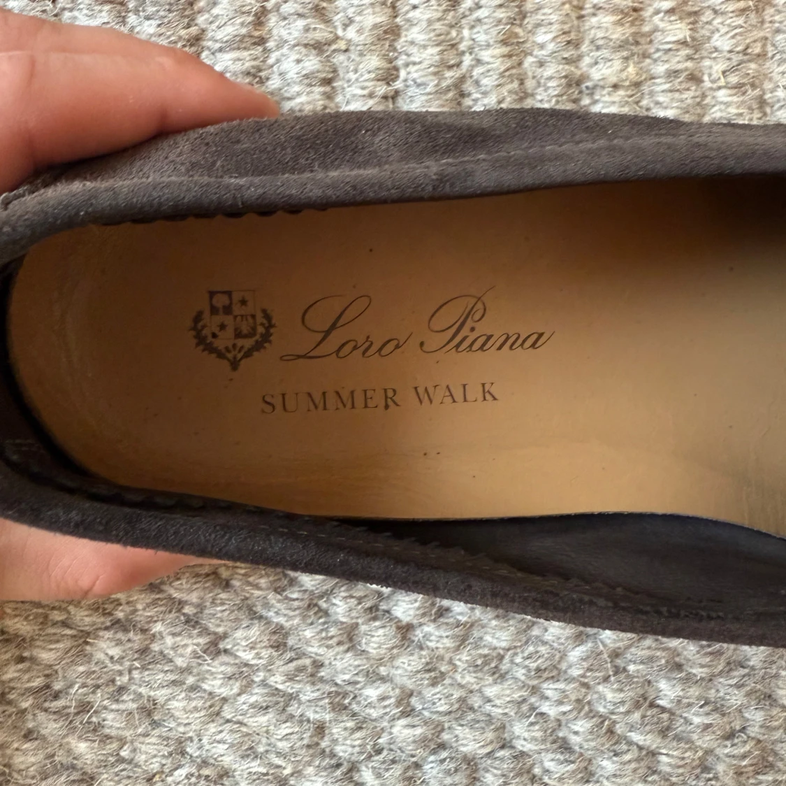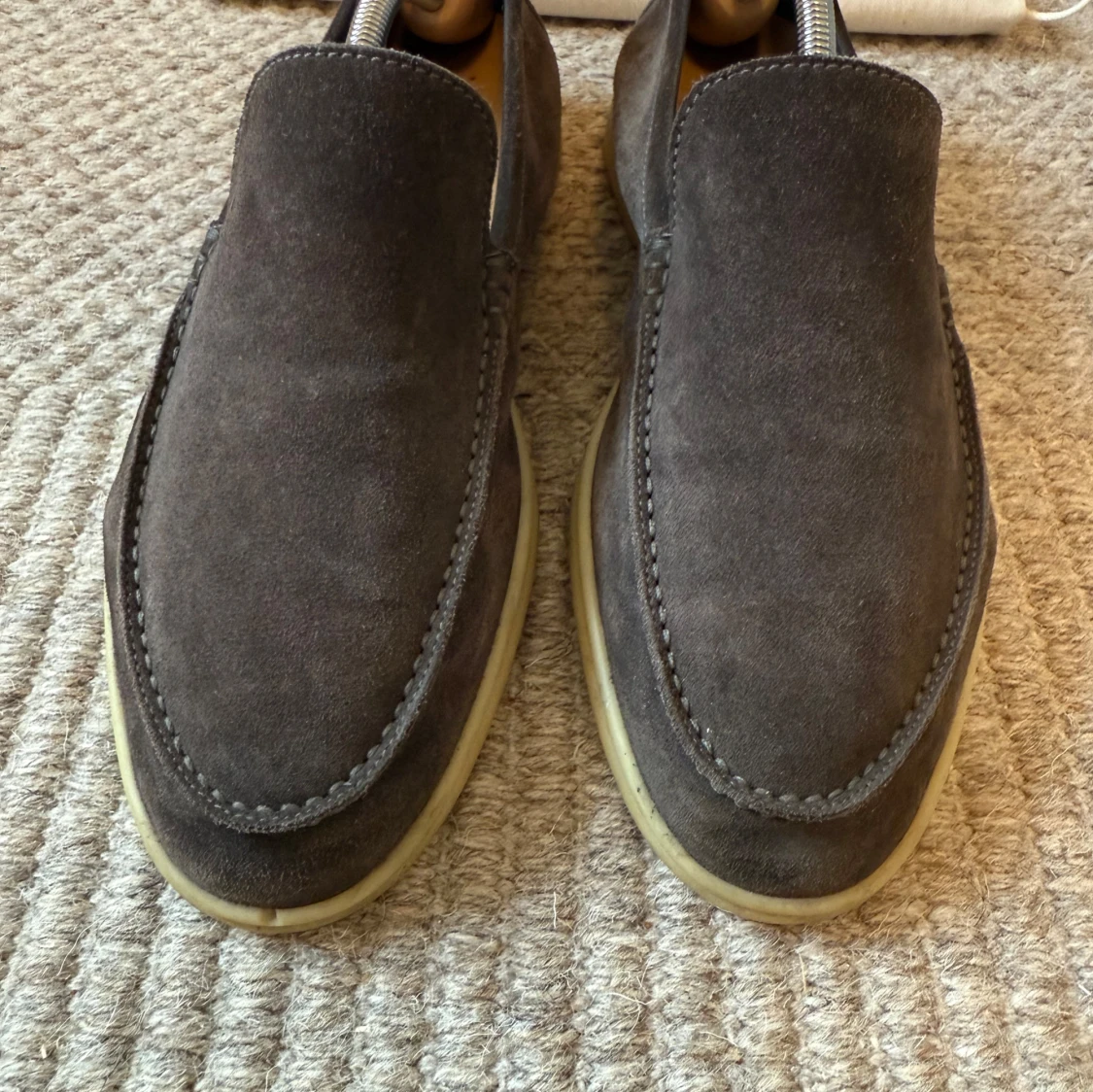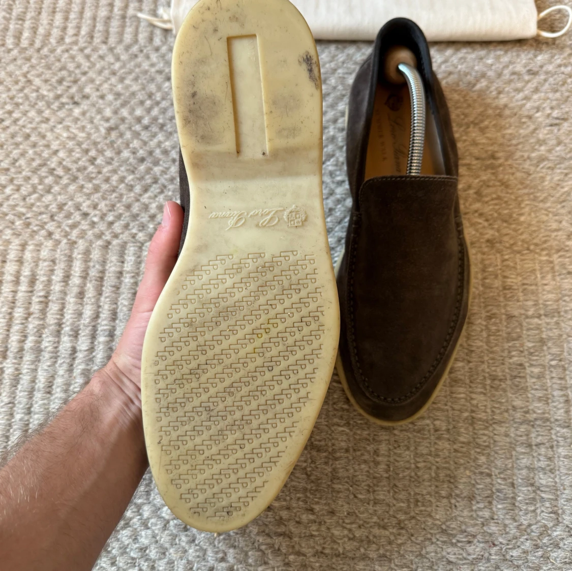 Mörkbruna loafers från Loro Piana i mjuk mocka med ljus gummisula. Klassisk och stilren design med rund tå och diskreta sömmar. Perfekta för en avslappnad men ändå uppklädd look. Kommer med originalkartong och dustbag.