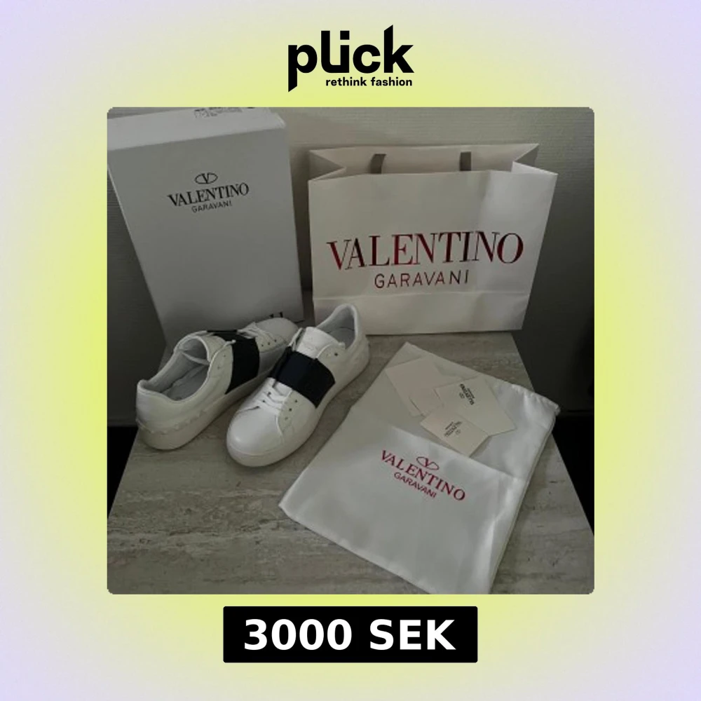 Säljer ett par snygga vita sneakers från Valentino Garavani med ett brett svart band över mitten. Skorna har rund tå, platt sula och klassisk snörning. Kommer med originalkartong, dustbag och påse.