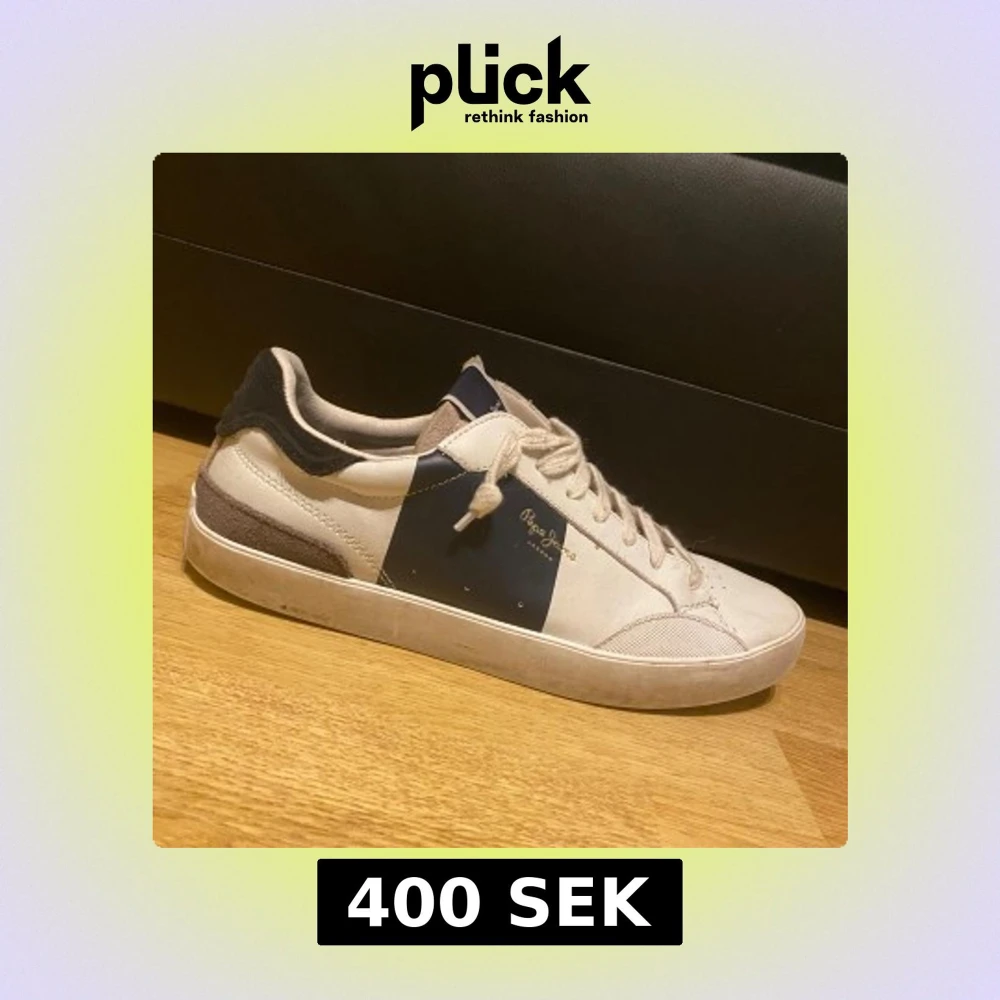 Snygga vita sneakers från Pepe Jeans med blå panel på sidan och grå detaljer vid häl och plös. Skorna har snörning och platt sula, samt rund tå. Perfekta för en stilren och avslappnad look. Lite smutsiga på undersidan men knappt andvända. Säljer för 400kr