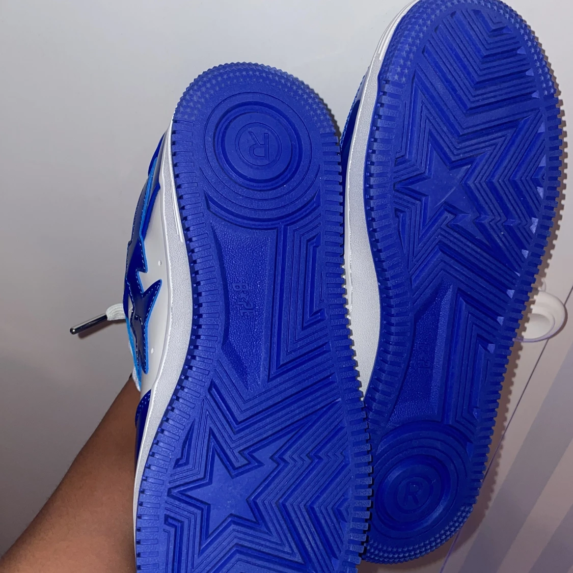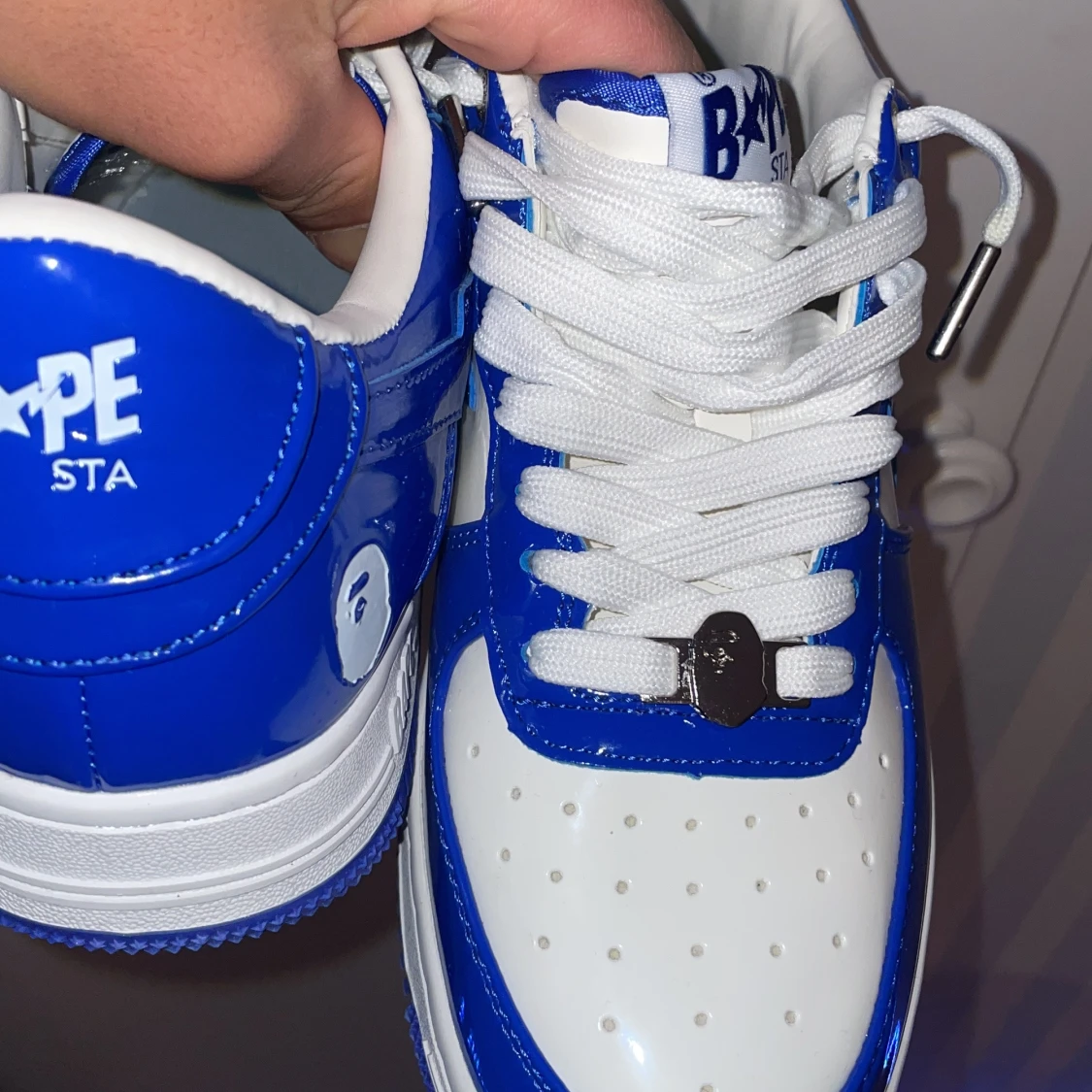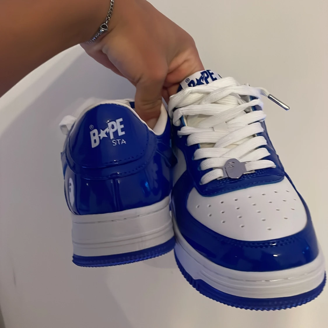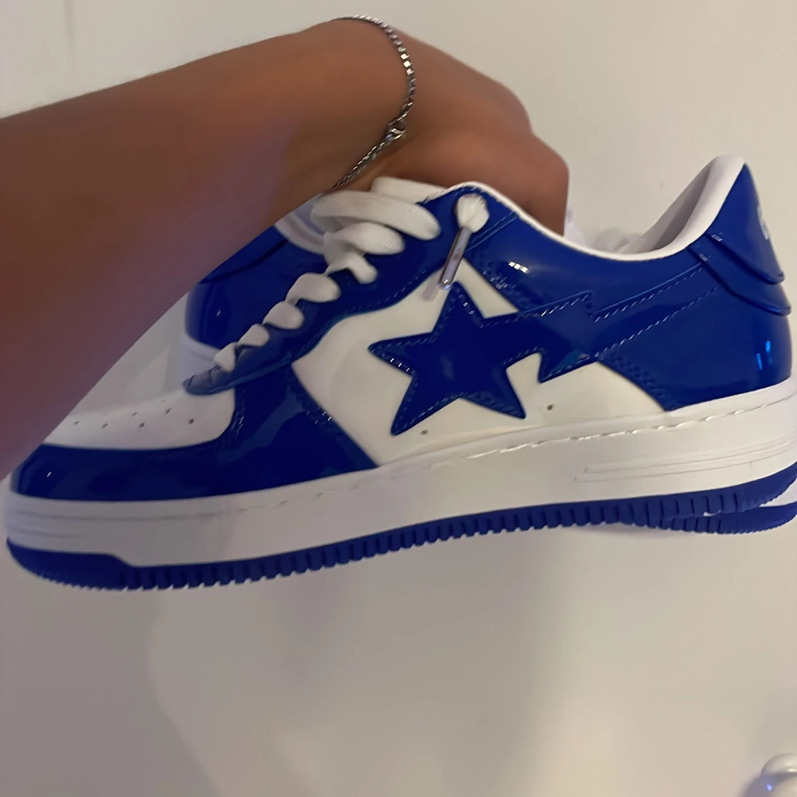 Snygga blå och vita sneakers från BAPE med en glansig finish. Skorna har en stjärndetalj på sidan och klassisk snörning. Perfekta för att ge din outfit en cool touch. Helt nya ge Bud!