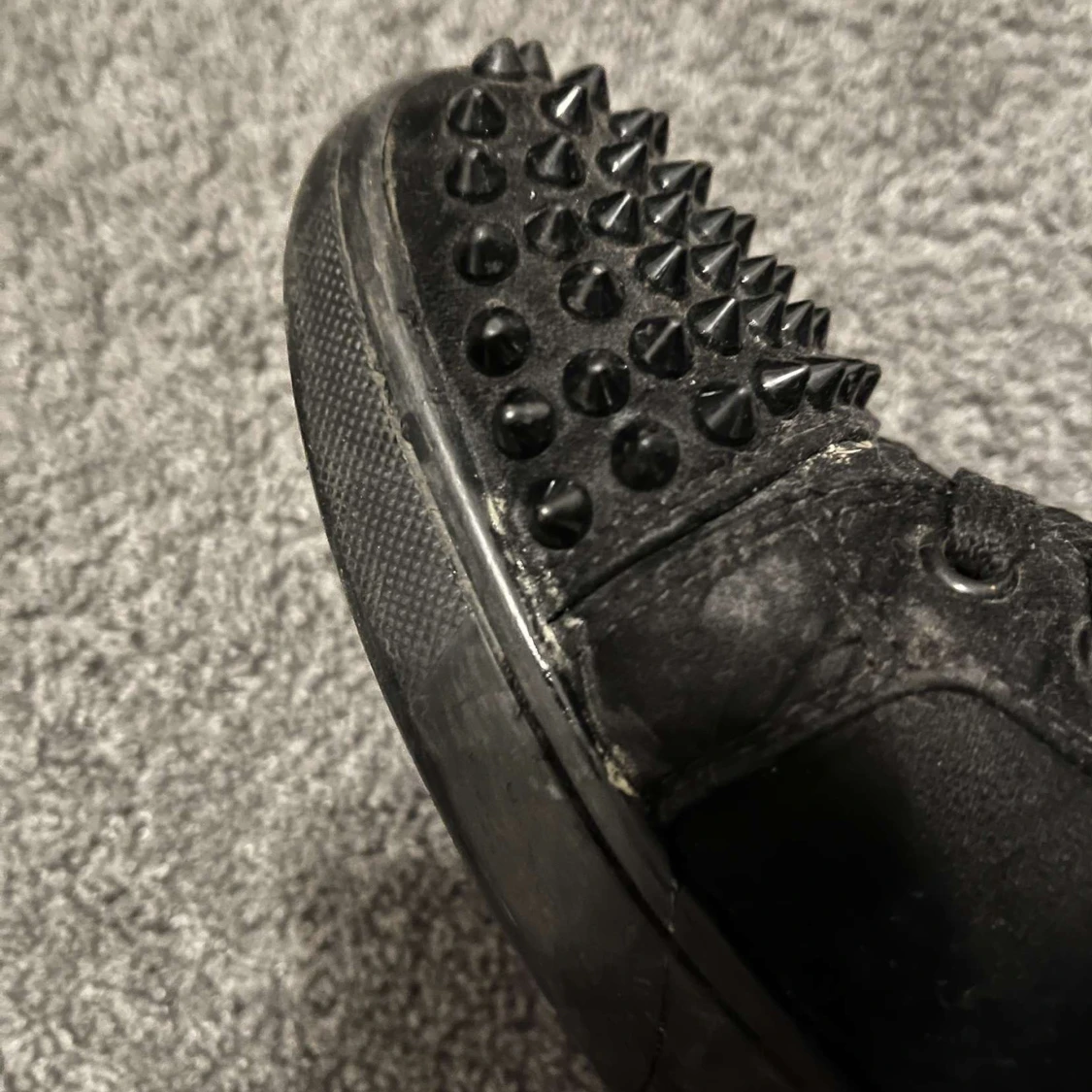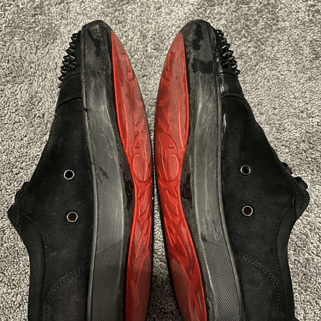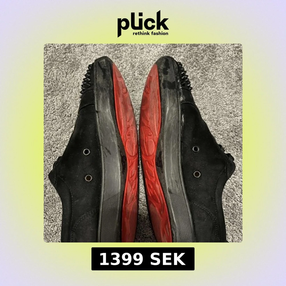 Snygga svarta sneakers med nitar på tån och röd sula. Skorna har snörning och en stilren design som sticker ut. Det kommer ej med box eller kvitto och lite slitna där fram som man kan se på bilden!!