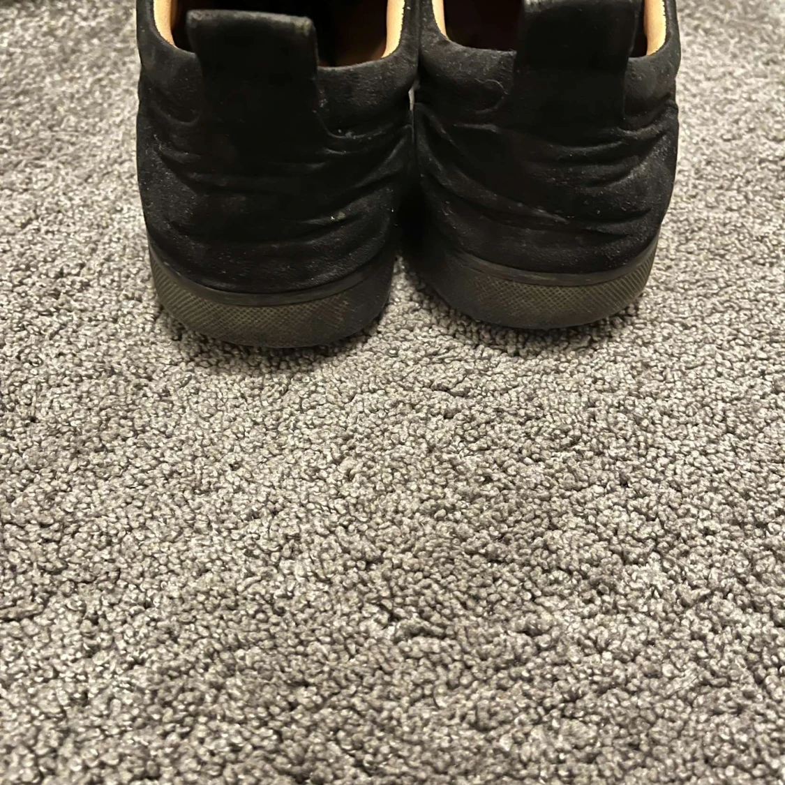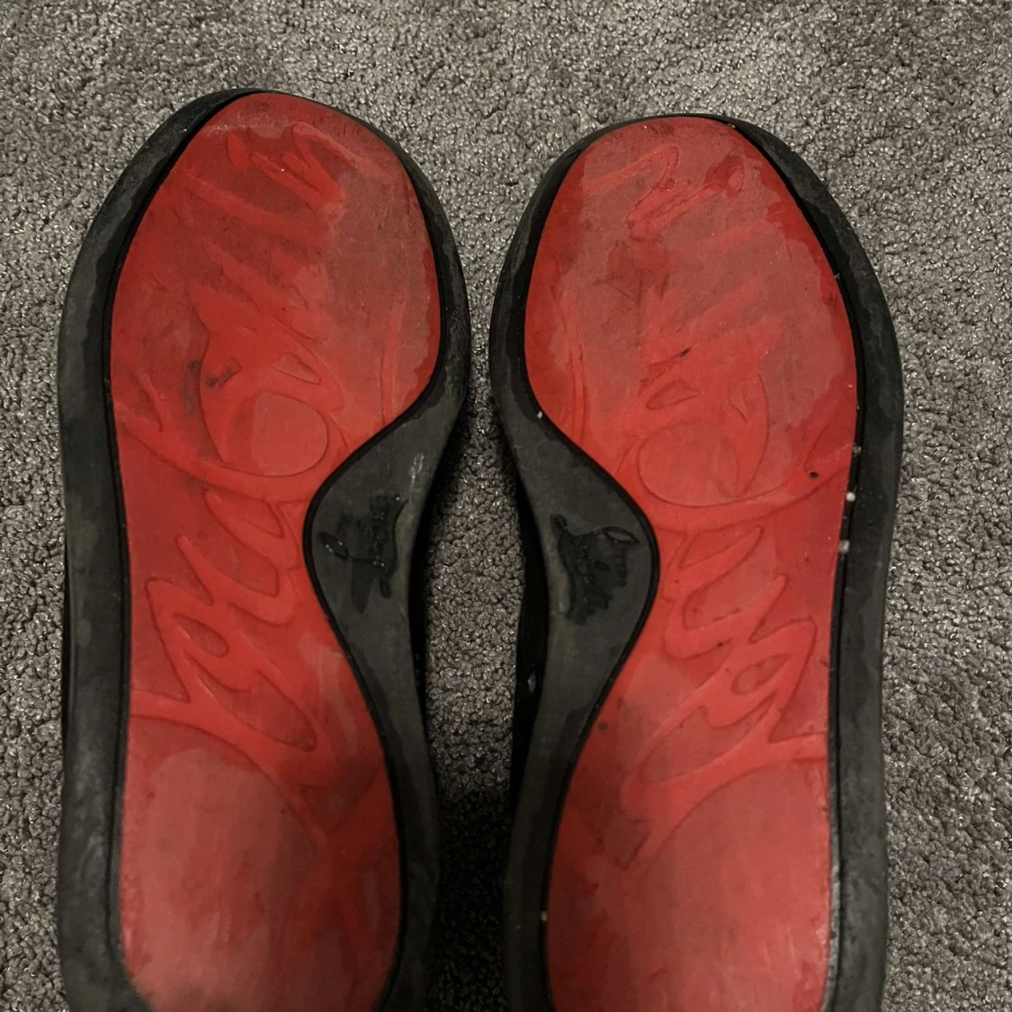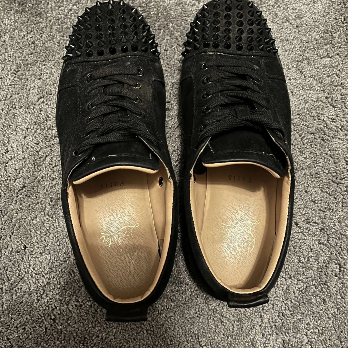Snygga svarta sneakers med nitar på tån och röd sula. Skorna har snörning och en stilren design som sticker ut. Det kommer ej med box eller kvitto och lite slitna där fram som man kan se på bilden!!