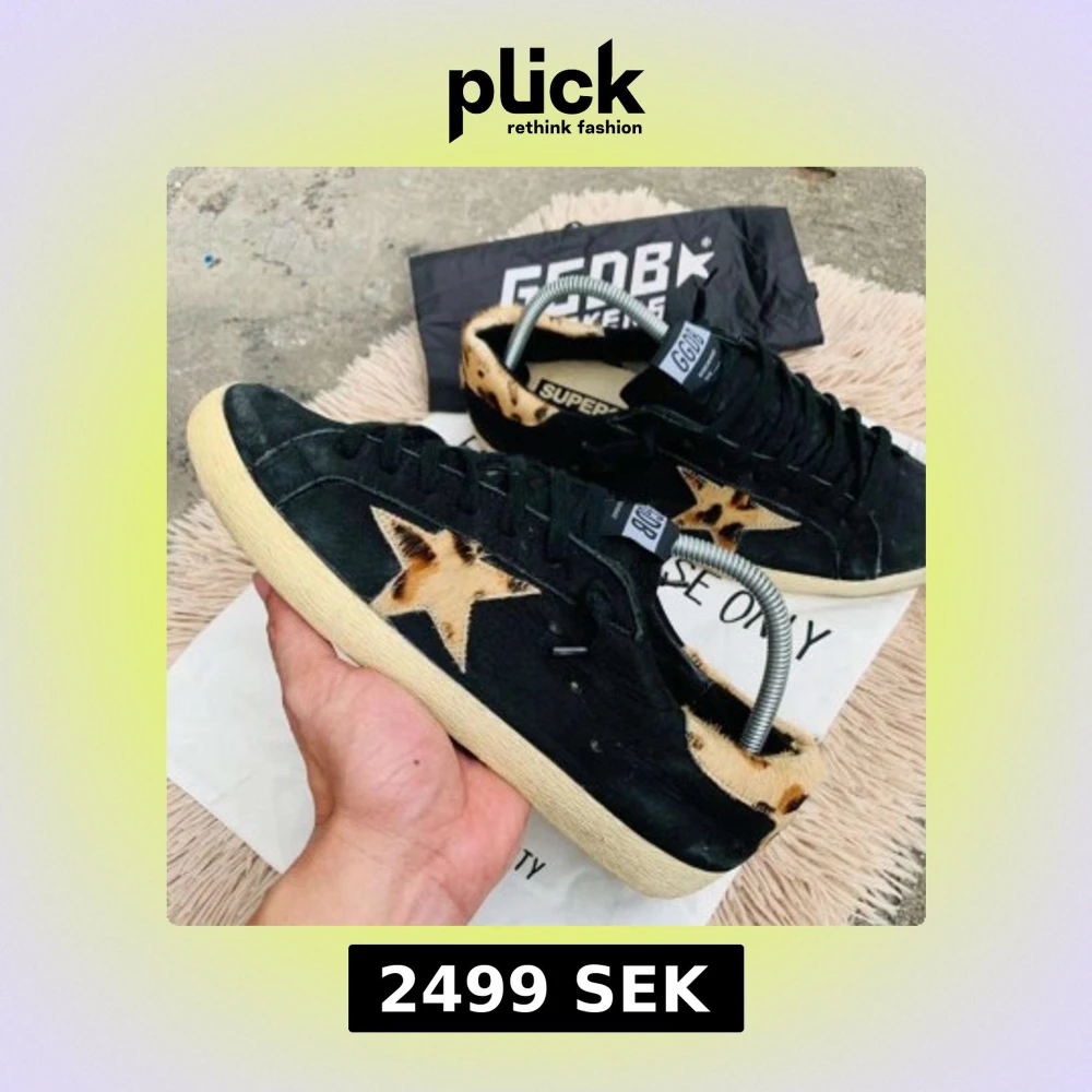 Snygga svarta sneakers från GGDB med leopardmönstrade detaljer på häl och stjärna på sidan. Skorna har en klassisk snörning och en bekväm sula i beige. Perfekta för dig som vill ha en unik stil.