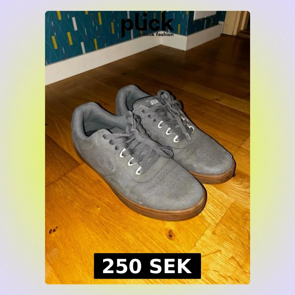 Säljer ett par gråa Etnies sneakers i mocka med bruna gummisulor. Skorna har snörning, perforerade detaljer på tån och en klassisk låg profil. Perfekta för dig som gillar skate eller streetstil.