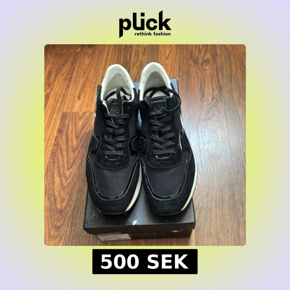 Säljer ett par stilrena sneakers från Kazar. Svarta med vit sula, i en kombination av mocka, textil och lackdetaljer. Skorna är i okej skick – de har använts men är fortfarande fullt funktionella och snygga. Perfekta som vardagssneakers eller som ett prisvärt alternativ till nya märkesdojor. Storlek: 42 Skick: Okej, använda men i bra bruksskick Nypris: ca 1300–1500 kr