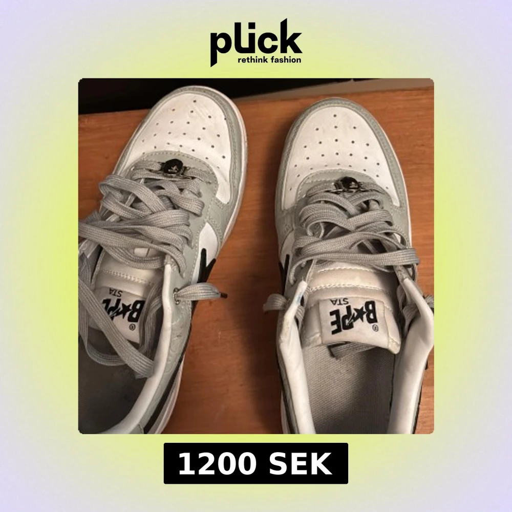 Snygga grå och vita sneakers från Bape med svart stjärndetalj på sidan. Skorna har snörning och perforerade detaljer på tån för extra ventilation. Perfekta för en stilren look. Kommer med vita sko snören Bape påse och bape box. PRIS DISKUTERAS 8/10 skick