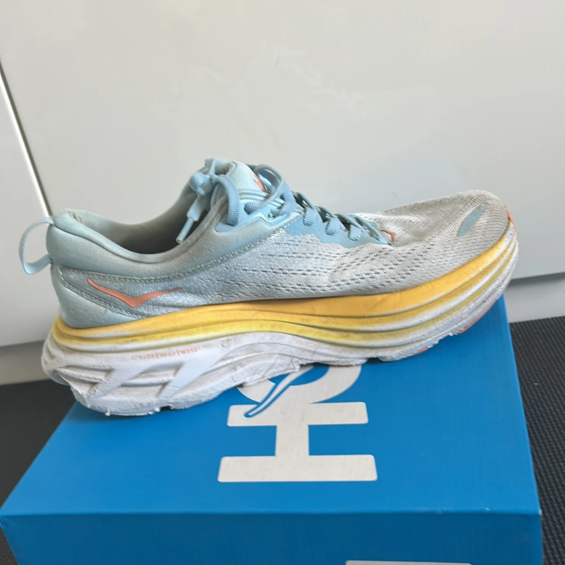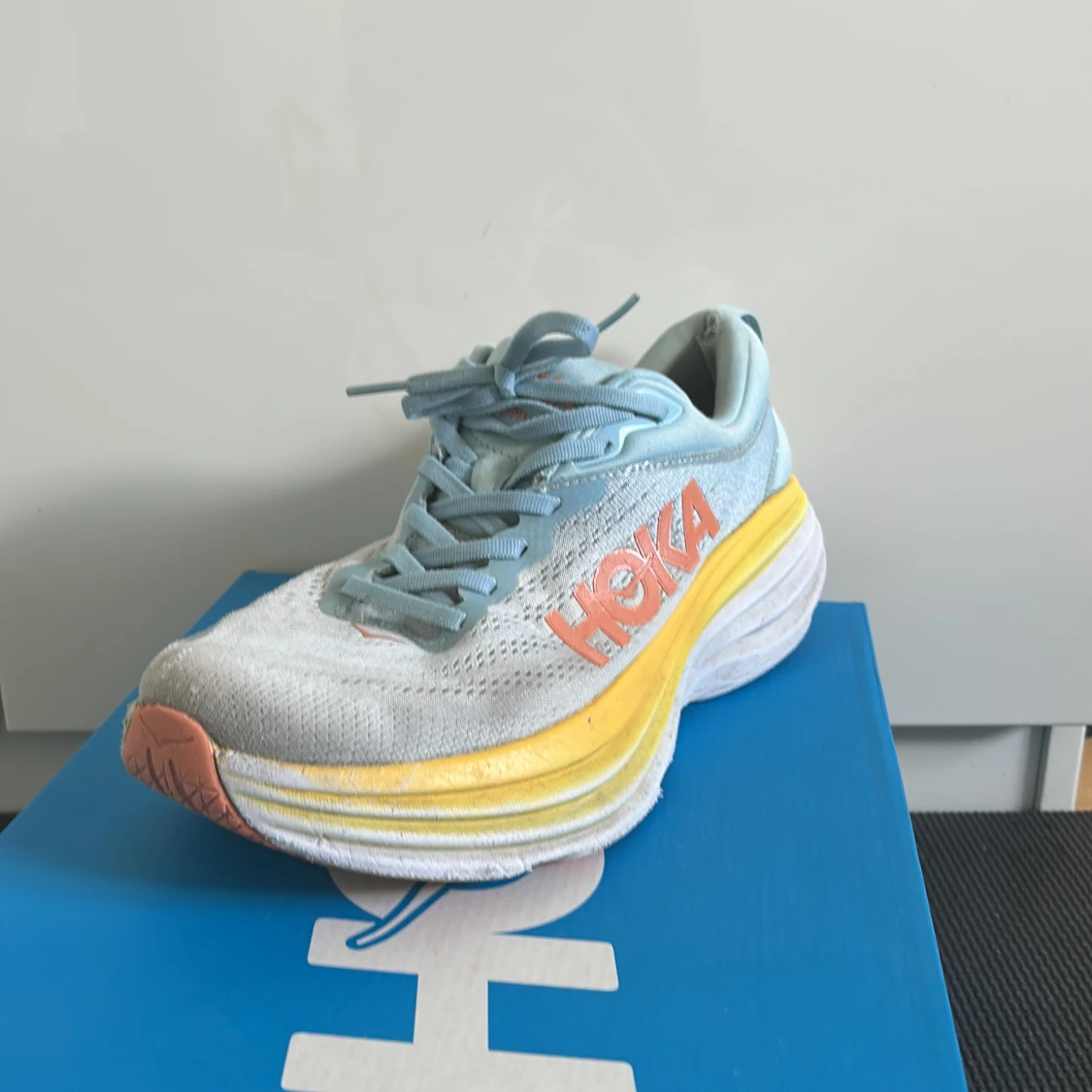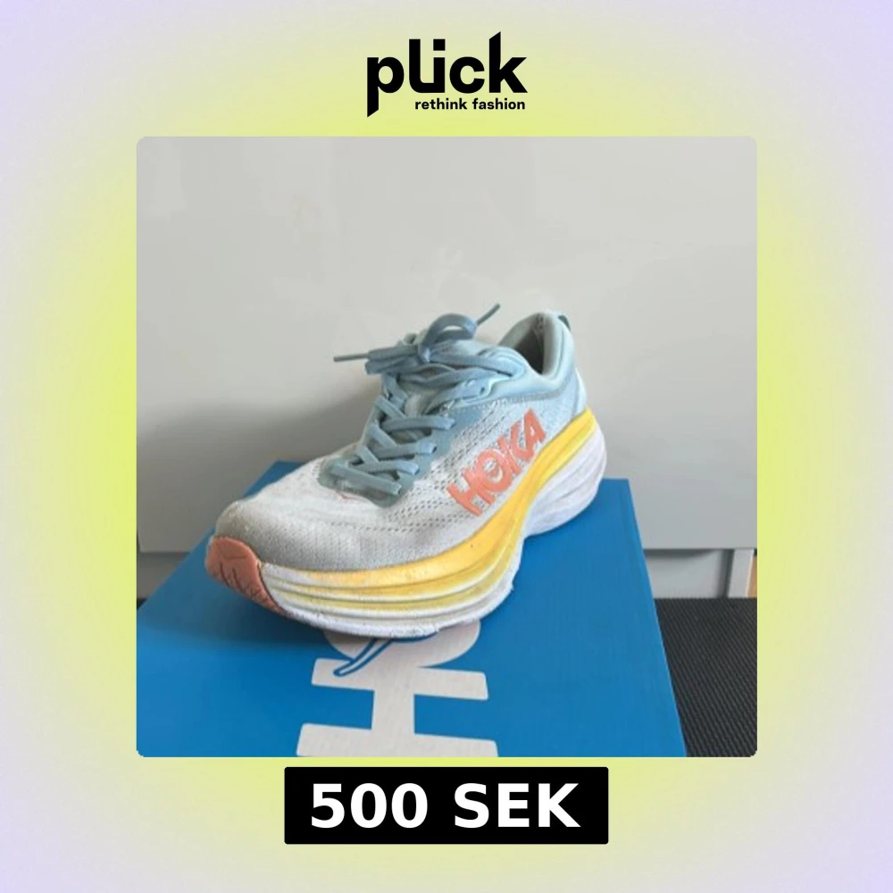 Säljer ett par Hoka Bondi 8 sneakers i ljusblått mesh med gula och vita detaljer samt orange Hoka-logga. Skorna har snörning och en riktigt tjock, dämpad sula för maxad komfort. Perfekta för dig som gillar att springa eller promenera långt. Får med original lådan. Nypris 1999 och säljer så billigt för skadorna vid hälen.