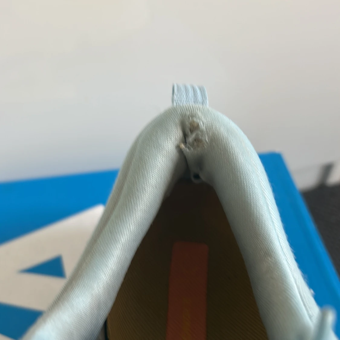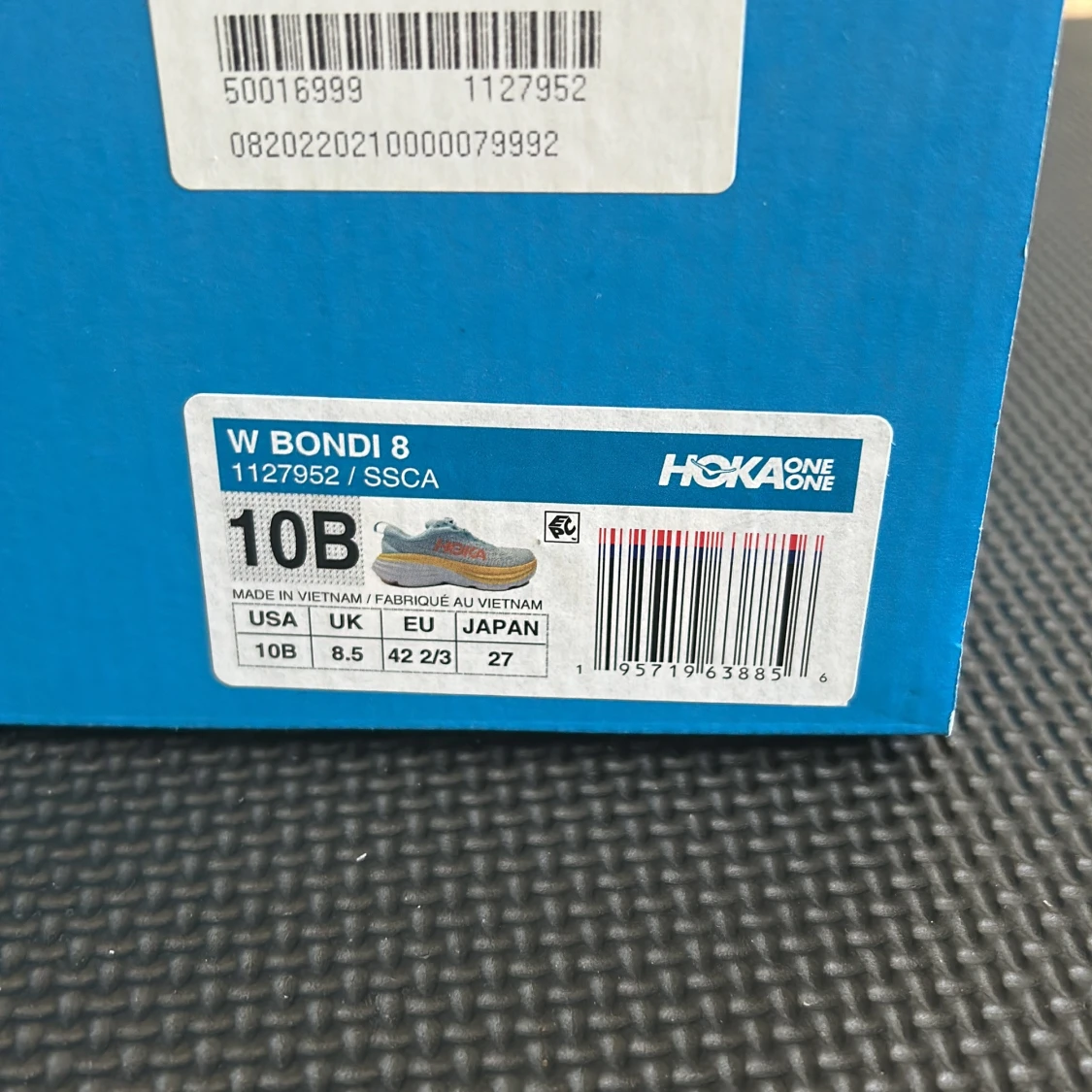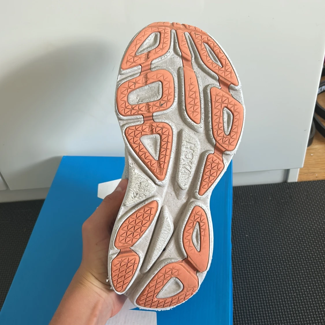 Säljer ett par Hoka Bondi 8 sneakers i ljusblått mesh med gula och vita detaljer samt orange Hoka-logga. Skorna har snörning och en riktigt tjock, dämpad sula för maxad komfort. Perfekta för dig som gillar att springa eller promenera långt. Får med original lådan. Nypris 1999 och säljer så billigt för skadorna vid hälen.