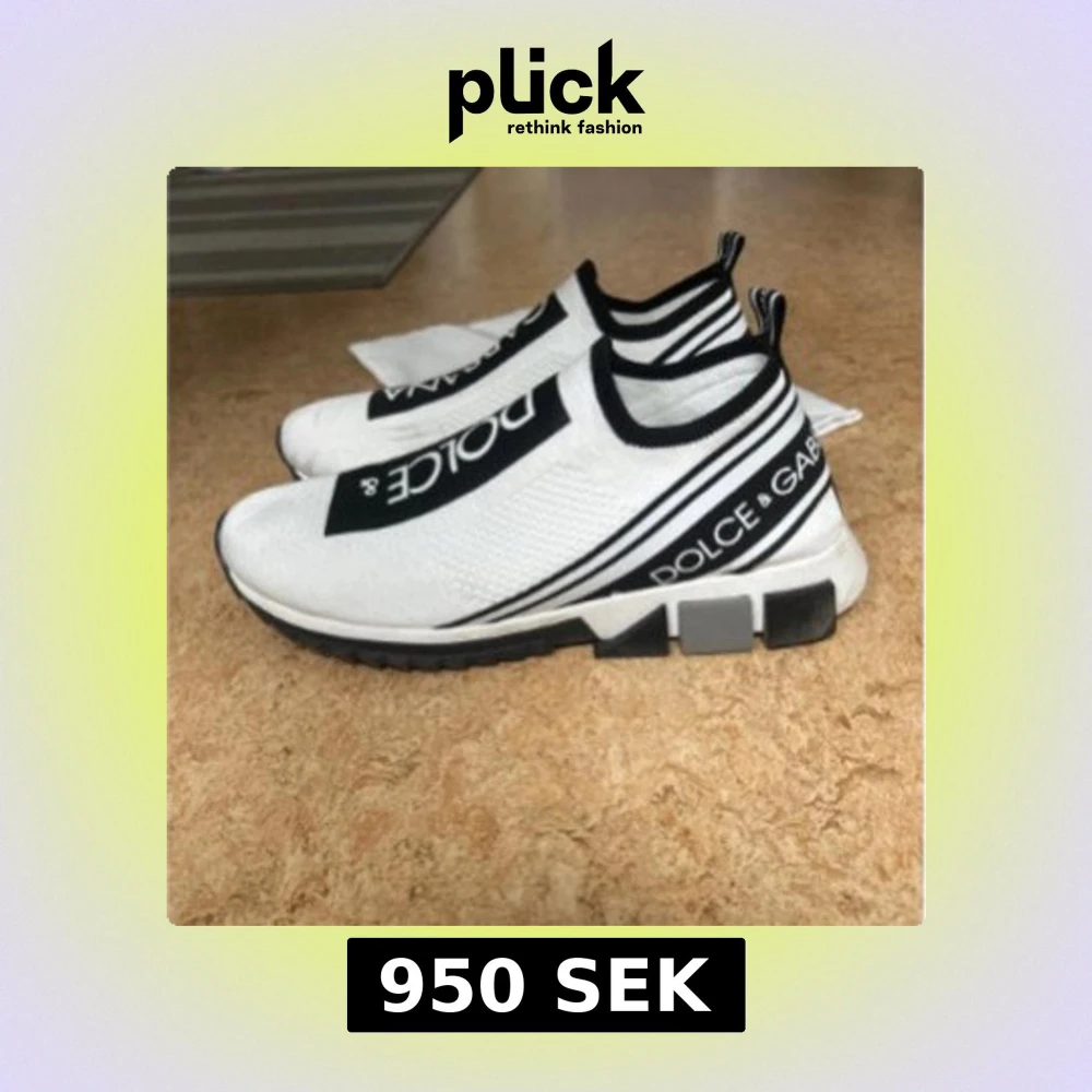 Säljer ett par vita Dolce & Gabbana sneakers med svart logotyp på ovansidan och sidan. Skorna har elastisk ovandel i textil, svart-vit randig hälflik och kraftig, mönstrad sula. Snygg och sportig design med slip-on modell.