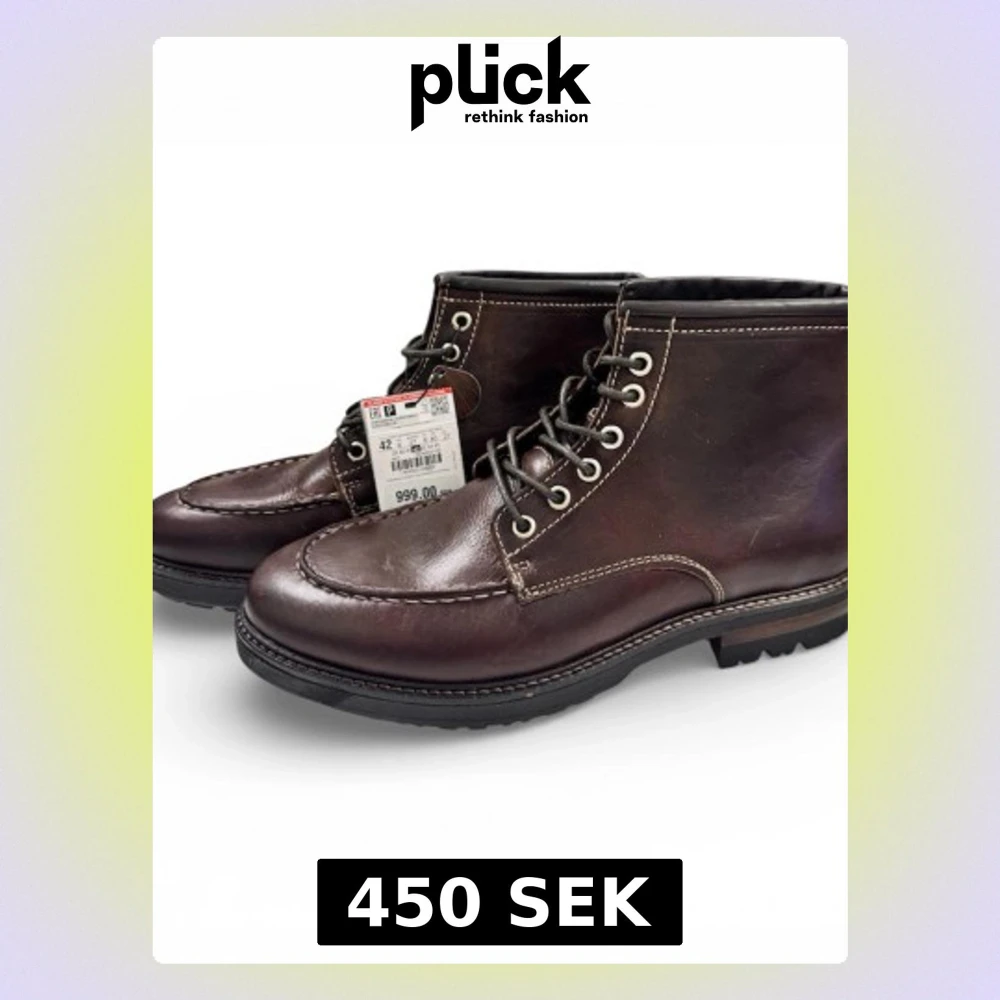 Stilrena bruna boots i skinn från Zara Man med grov sula och snörning framtill. Skorna har rund tå, kontrastsömmar och robust yttersula för extra grepp. Perfekta för dig som gillar klassisk och tidlös stil.