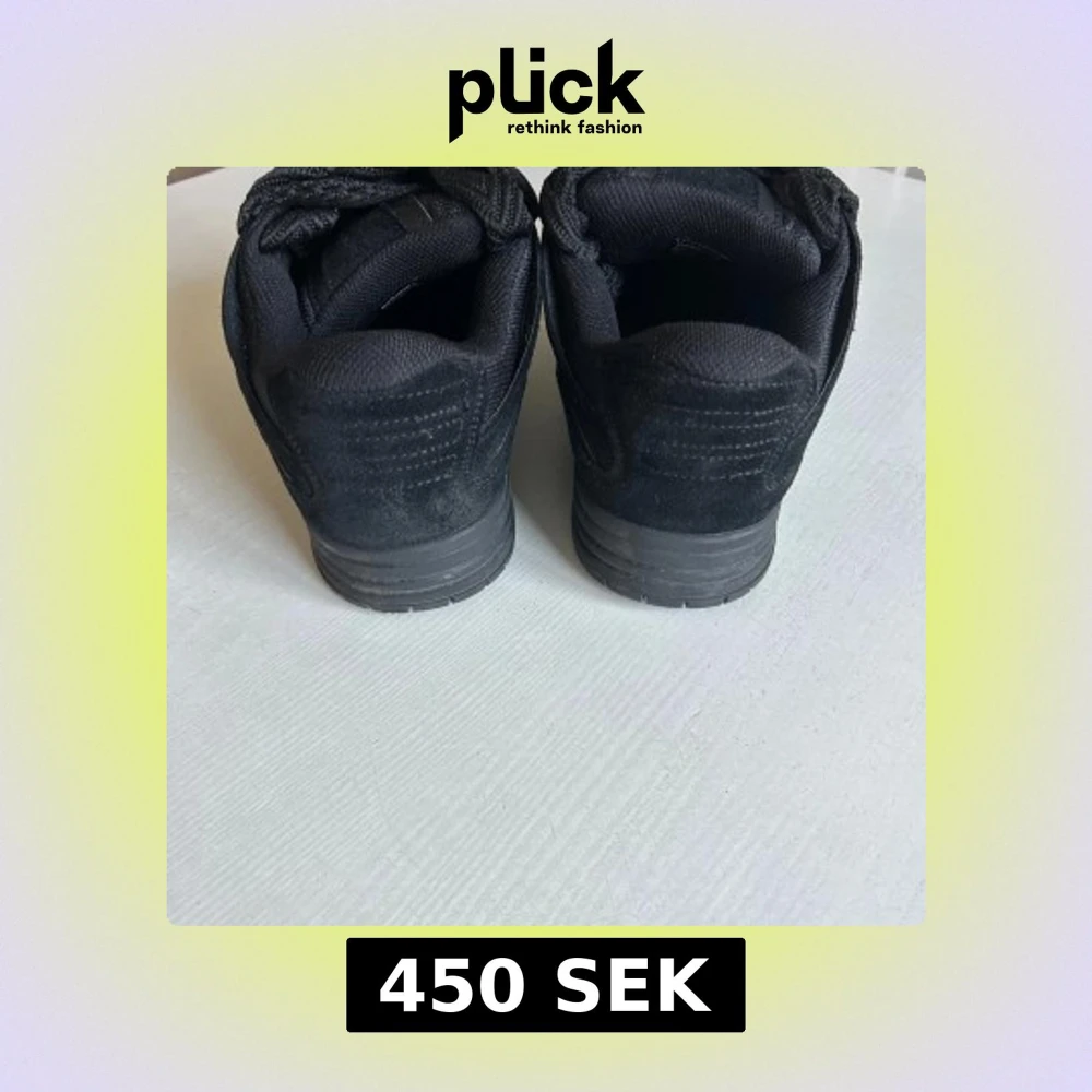 Säljer ett par helsvarta sneakers med riktigt breda och grova snören. Skorna har en sportig look med rund tå och platt sula. Passar perfekt till dig som vill ha en unik detalj på fötterna. Materialet är syntet och textil.