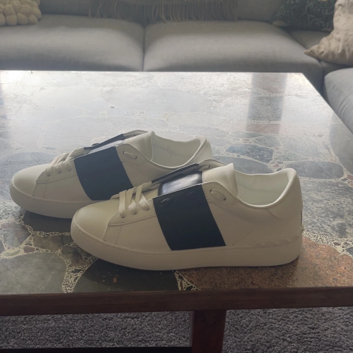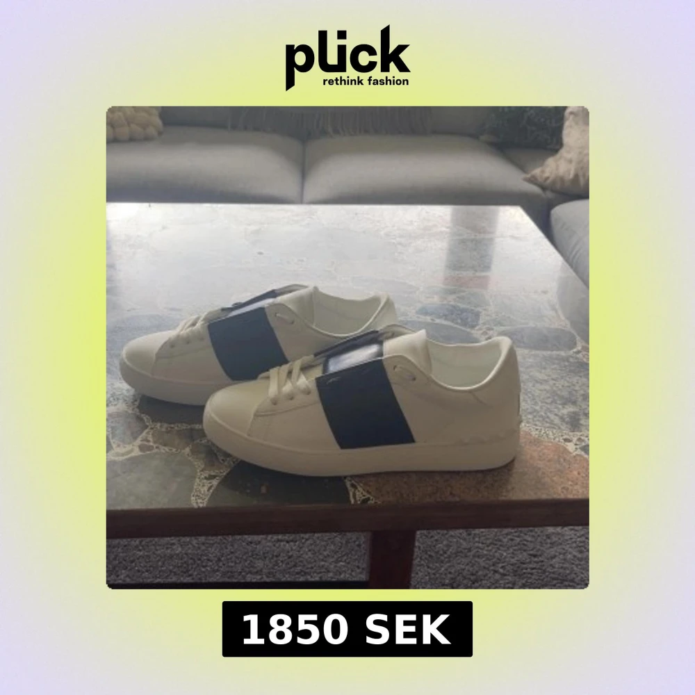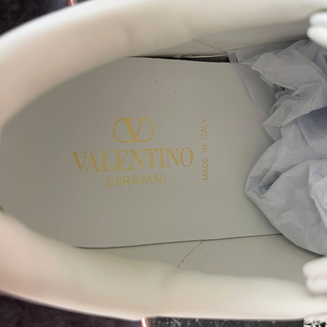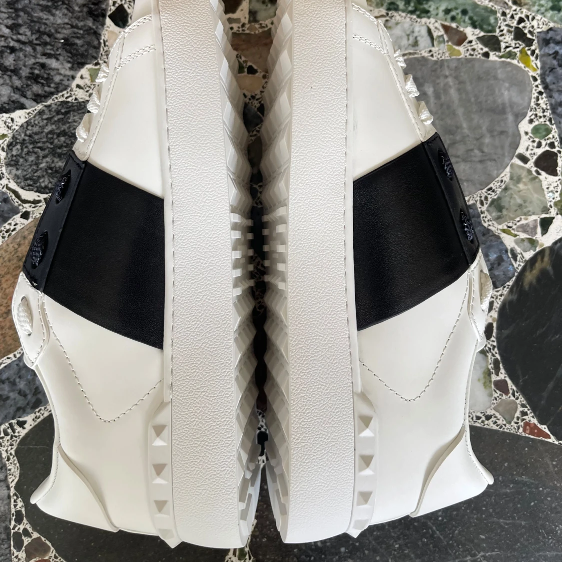 Snygga vita sneakers från Valentino Garavani med bred svart läderdetalj över snörningen och ikoniska nitar runt sulan. Skorna har rund tå och platt sula, perfekt för en stilren och modern look.