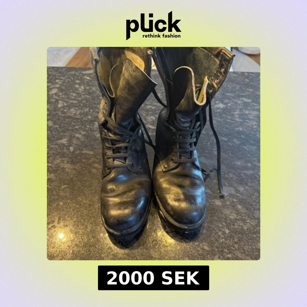Tunga svarta kängor i äkta skinn med snörning hela vägen upp och robust platt sula. Perfekta för dig som gillar en rå och tidlös look. Hög modell som ger stabilitet och attityd till outfiten. Nypris 450$