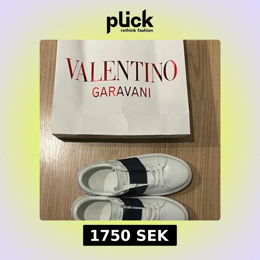 Säljer ett par snygga vita sneakers från Valentino Garavani med ett brett svart band över vristen och vita nitar på sidorna. Skorna har rund tå, platt sula och klassisk snörning. Perfekta för dig som gillar stilrena och exklusiva sneakers.
