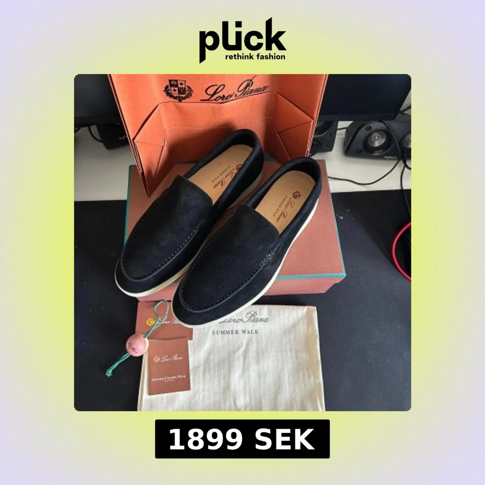 Säljer ett par stilrena svarta loafers från Loro Piana Summer Walk. Skorna har en mjuk ovandel i mocka och en vit platt sula som ger en clean look. Perfekta för dig som gillar klassisk design med lyxig känsla. Kommer med originalpåse och box.