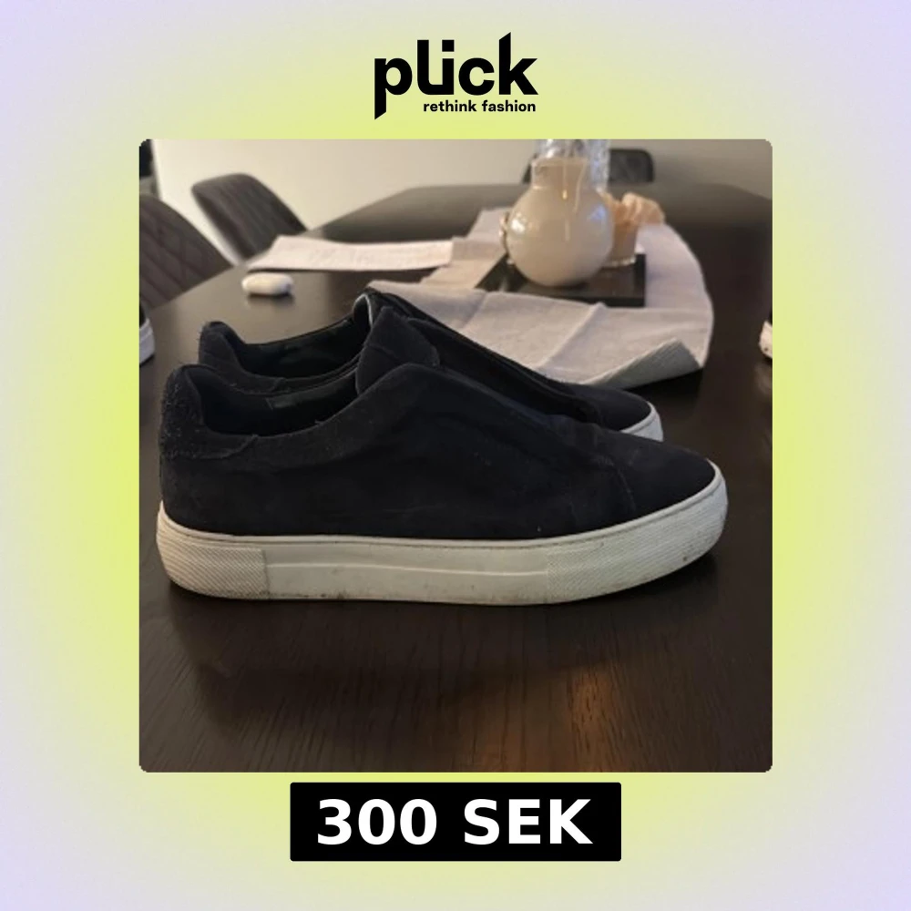 Säljer ett par svarta sneakers i mocka med stilren design och vit platt sula. Skorna har rund tå och är utan synliga snören för en minimalistisk look. Perfekta för dig som gillar enkel och clean stil Box ingår!!.