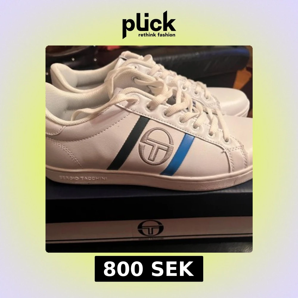 Snygga vita sneakers från Sergio Tacchini med klassisk logga på sidan och svarta samt blå detaljer. Skorna har snörning och är tillverkade i syntetmaterial med en platt sula. Perfekta för dig som gillar stilrena och sportiga skor med en touch av färg.