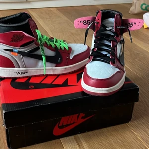 Off white jordan 1 chicago i strl 42, köpta från en pk batch vilket menas att de är en bra försäljning av ett par skor som är väldigt lika de äkta skorna, de har använts en gång men har inga problem eller märken!