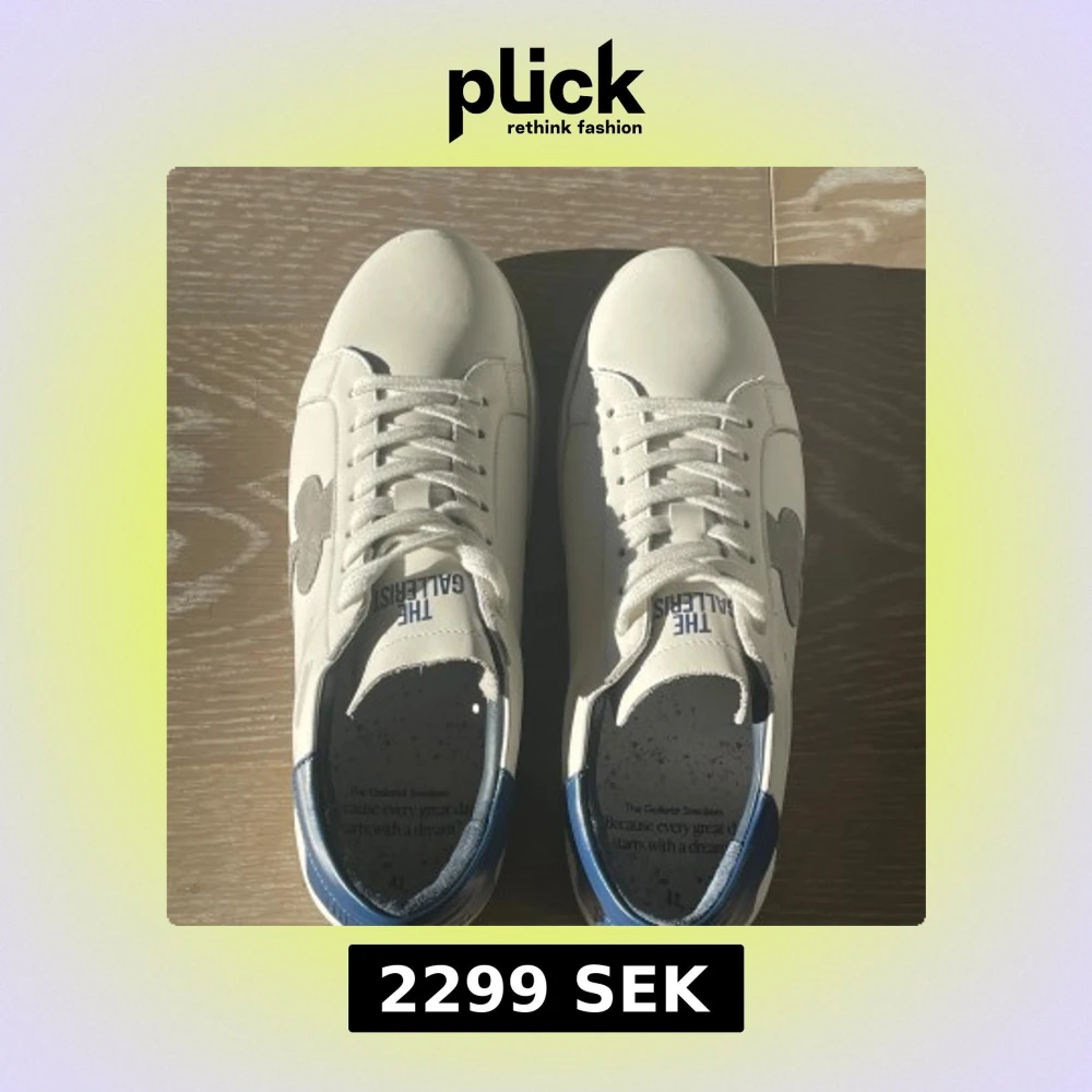 Snygga vita sneakers från The Gallerist med blå detalj på hälen och grått klubbmärke i mocka på sidan. Skorna har snörning, platt sula och är tillverkade i skinn med inslag av mocka. Perfekta för dig som gillar stilrena och unika detaljer. Har aldrig använt skorna.
