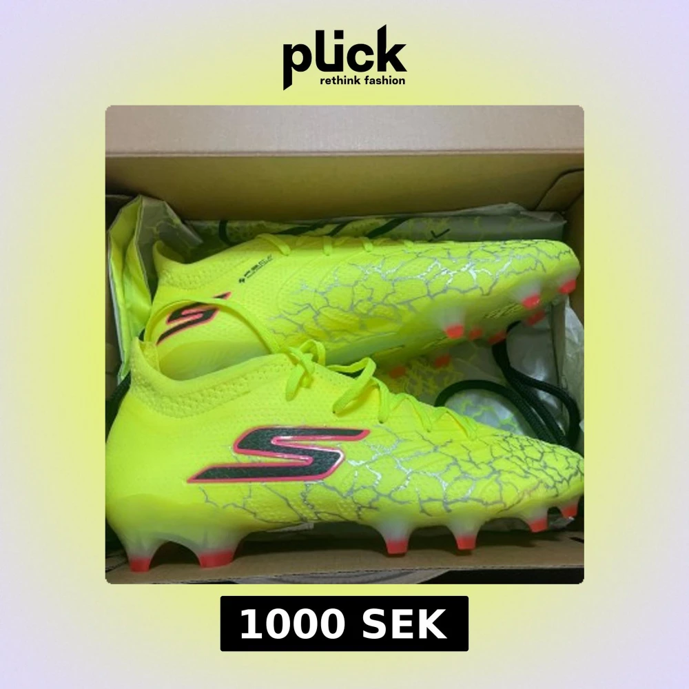 Säljer ett par riktigt snygga fotbollsskor från Skechers i neon-gult med svarta och röda detaljer. Skorna har ett coolt sprucket mönster och platt sula med dobbar för bra grepp på planen. Perfekta för dig som vill sticka ut på matchen!
