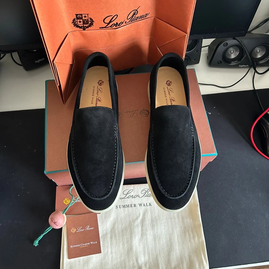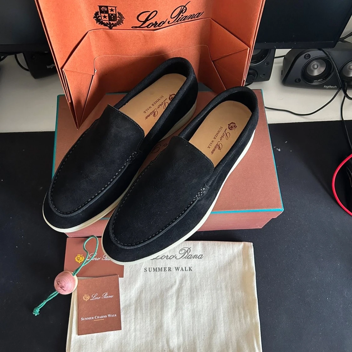 Snygga svarta loafers från Loro Piana Summer Walk med mjuk mocka och vit platt sula. Klassisk och stilren design med rund tå och diskret Loro Piana-logga på hälen. Perfekta för dig som gillar lyxiga och bekväma skor med exklusiv känsla.