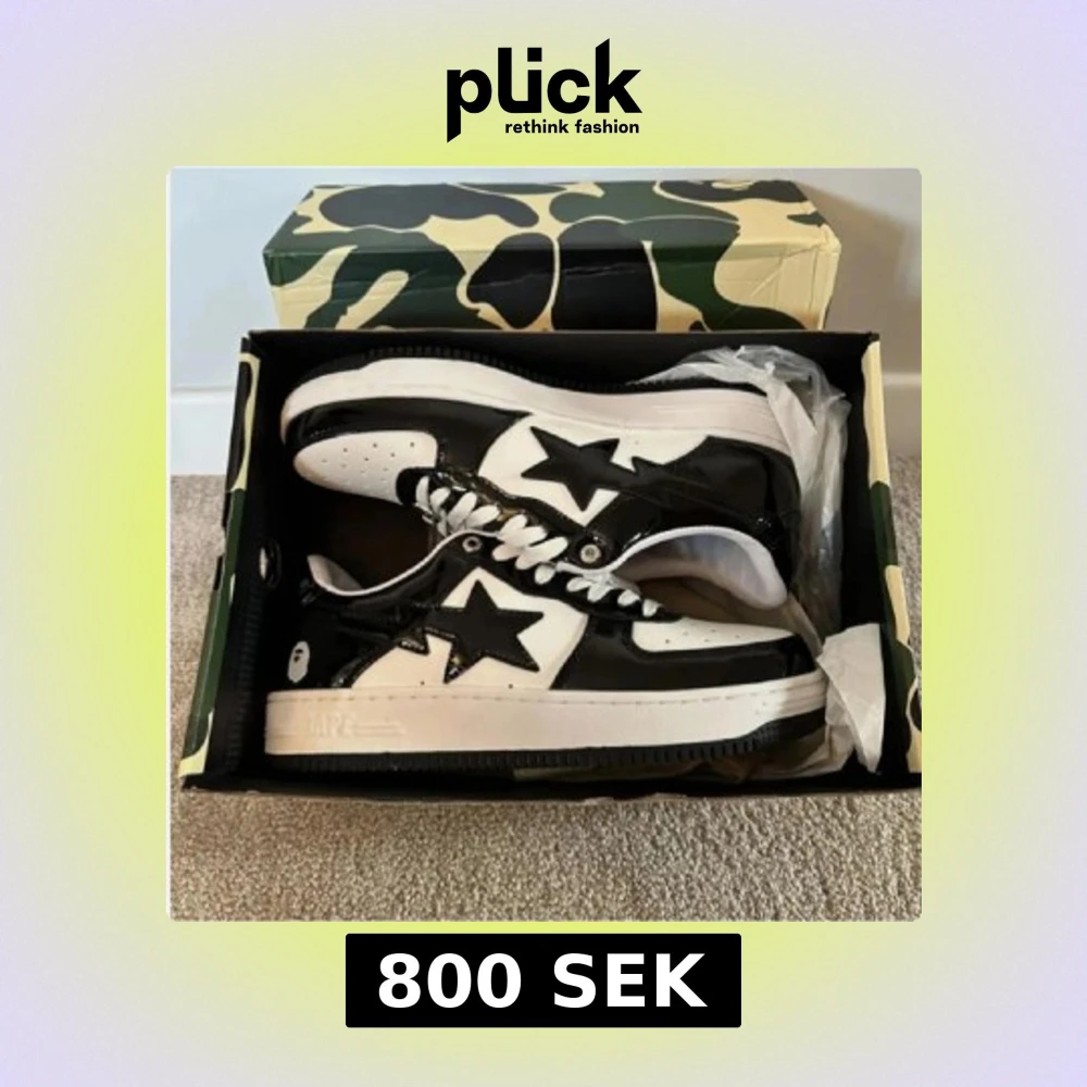 Säljer ett par Bape Sta sneakers i svart och vitt med klassisk stjärndesign på sidan. Skorna har snörning, platt sula och är tillverkade i blankt syntetmaterial. Kommer i originalkartong med camomönster. Perfekta för dig som gillar streetwear.