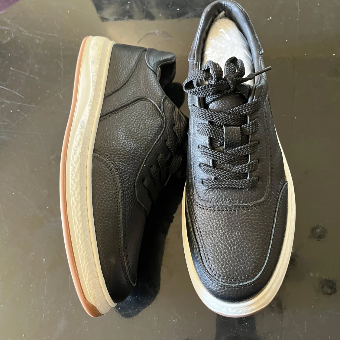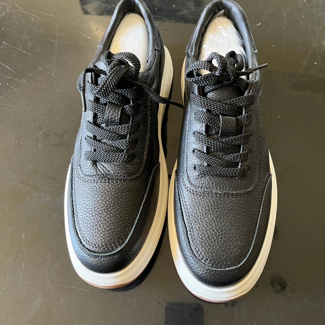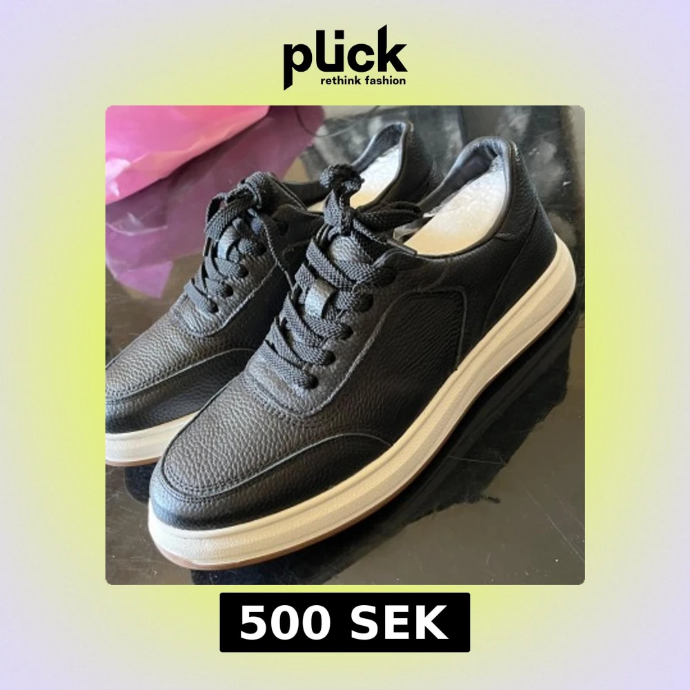 Stilrena svarta sneakers i grovpräglat skinn med klassisk snörning och vit platt sula. Skorna har rund tå och diskreta sömmar som ger en clean look. Perfekta för dig som gillar minimalistisk stil med en sportig touch.