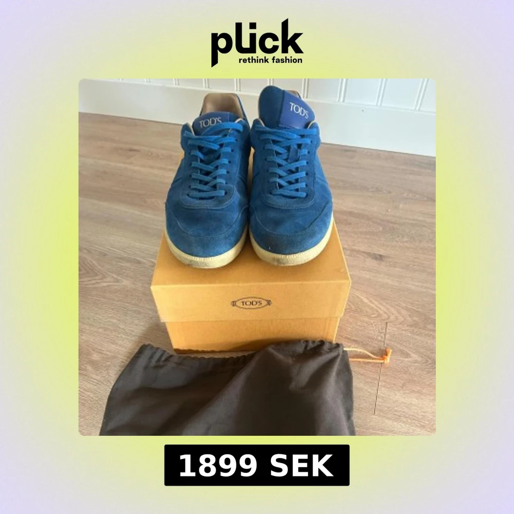 Snygga blå sneakers från Tod's i mjuk mocka med beige sula och klassisk snörning. Skorna har rund tå och coola gummidetaljer på hälen. Perfekta för dig som gillar stilrena och exklusiva sneakers med en unik touch. Nypris 450€