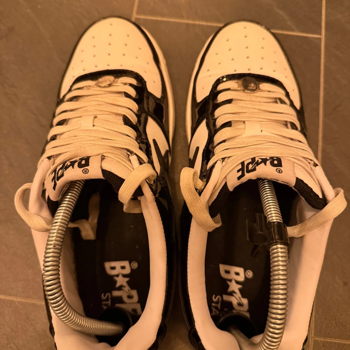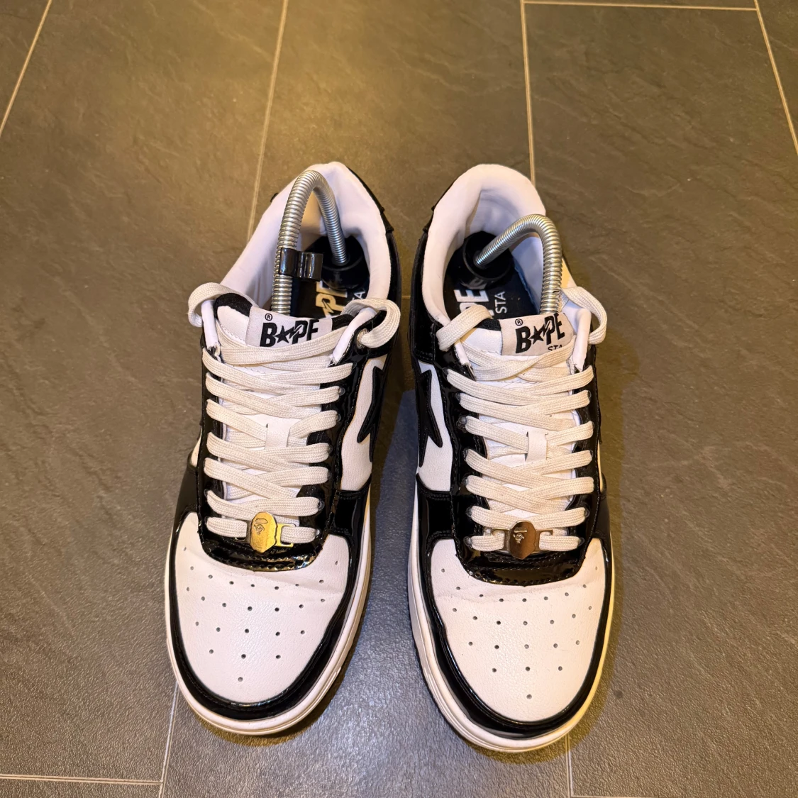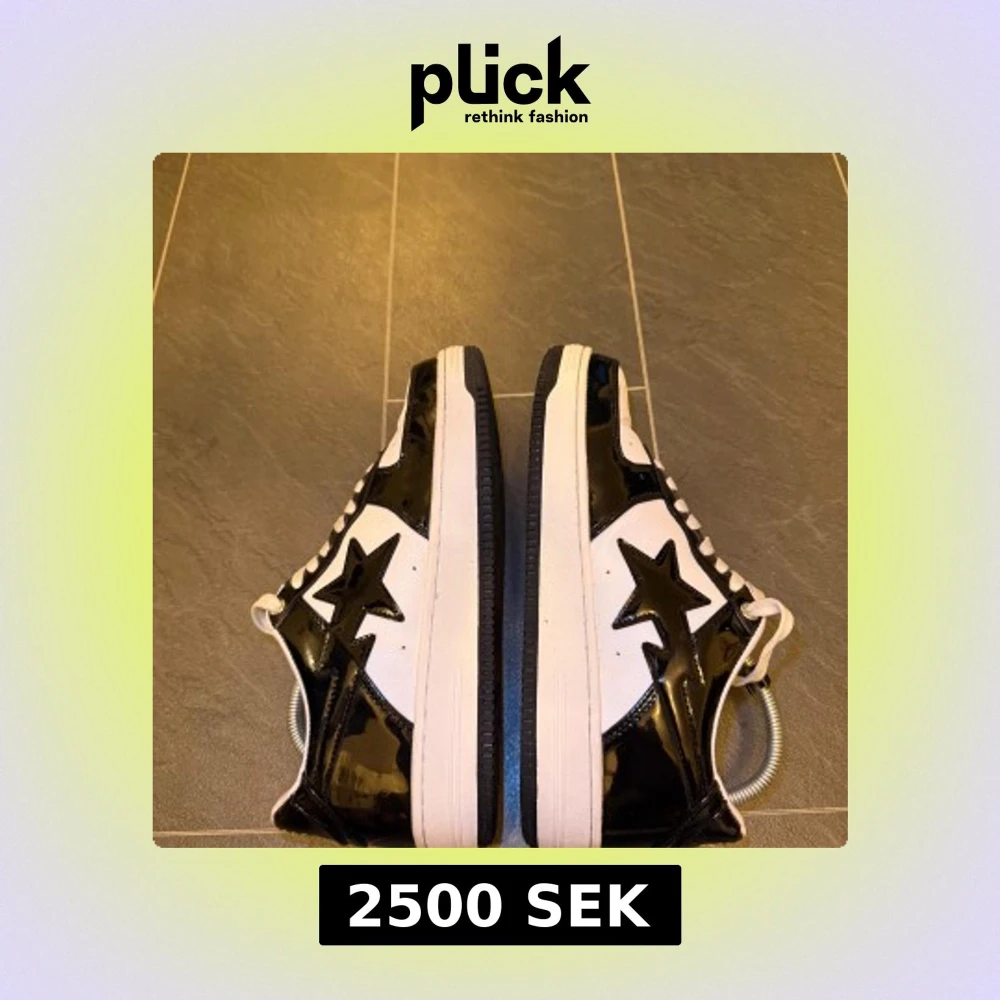 Säljer ett par Bape Sta sneakers i svart och vitt med glansiga paneler och den ikoniska stjärnan på sidan. Skorna har vit ovandel med svarta detaljer, klassisk snörning och låg profil. Perfekta för dig som gillar streetwear och vill sticka ut med en clean look.