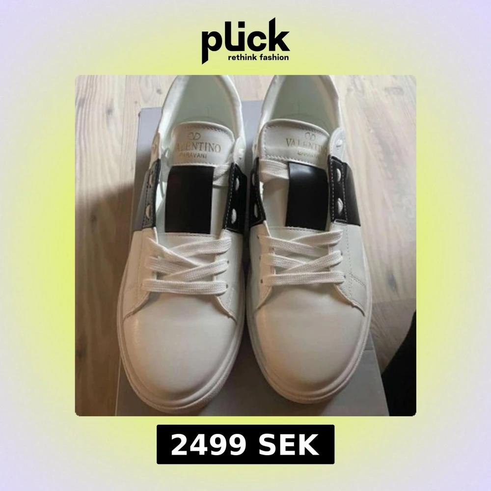 KVITTO FINS Snygga Valentino Garavani sneakers i vitt med en bred svart rem över snörningen. Skorna har en stilren design med vita snören och en diskret logga på plösen. Perfekta för en trendig look.