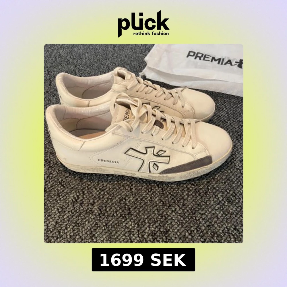 Snygga vita sneakers från Premiata i med grå detaljer och logga på sidan. Klassisk rund tå, snörning och coolt mönstrad sula. Perfekta för dig som gillar stilrena och trendiga skor. Skorna kommer med originalpåse. Väldigt sparsamt använda och i toppskick! Mitt pris är 1699👍 Vid frågor/liknande är det bara att höra av sig!