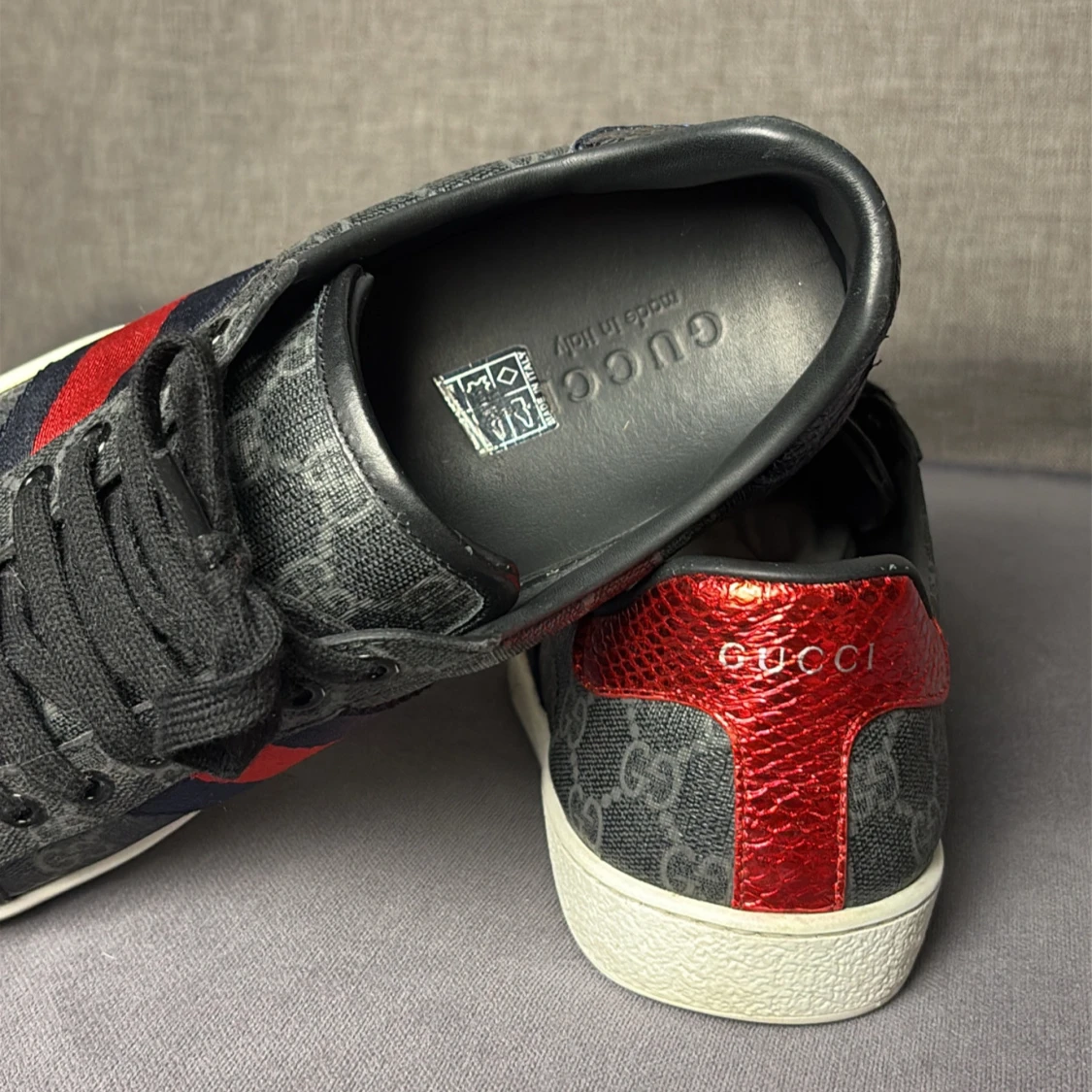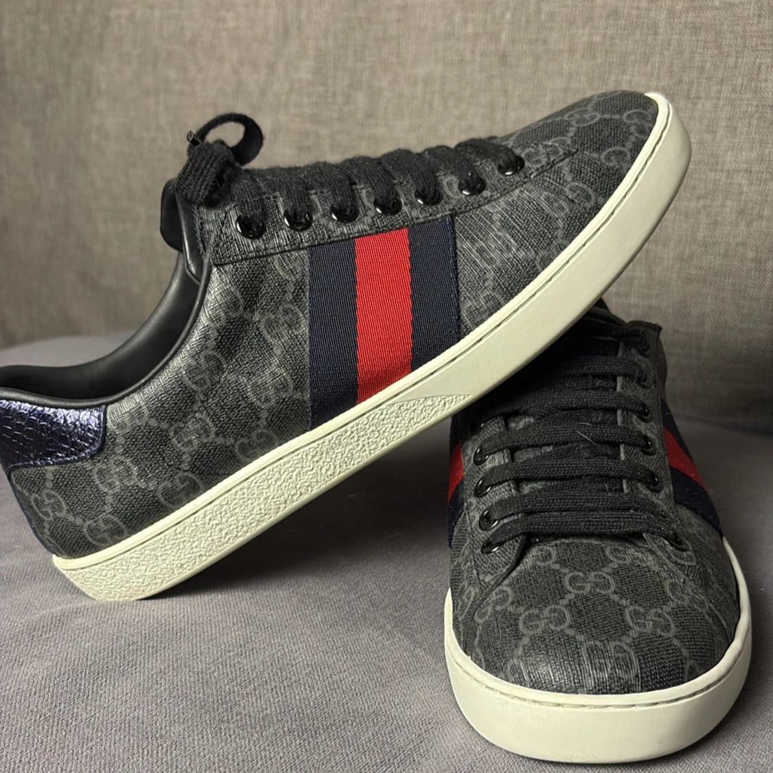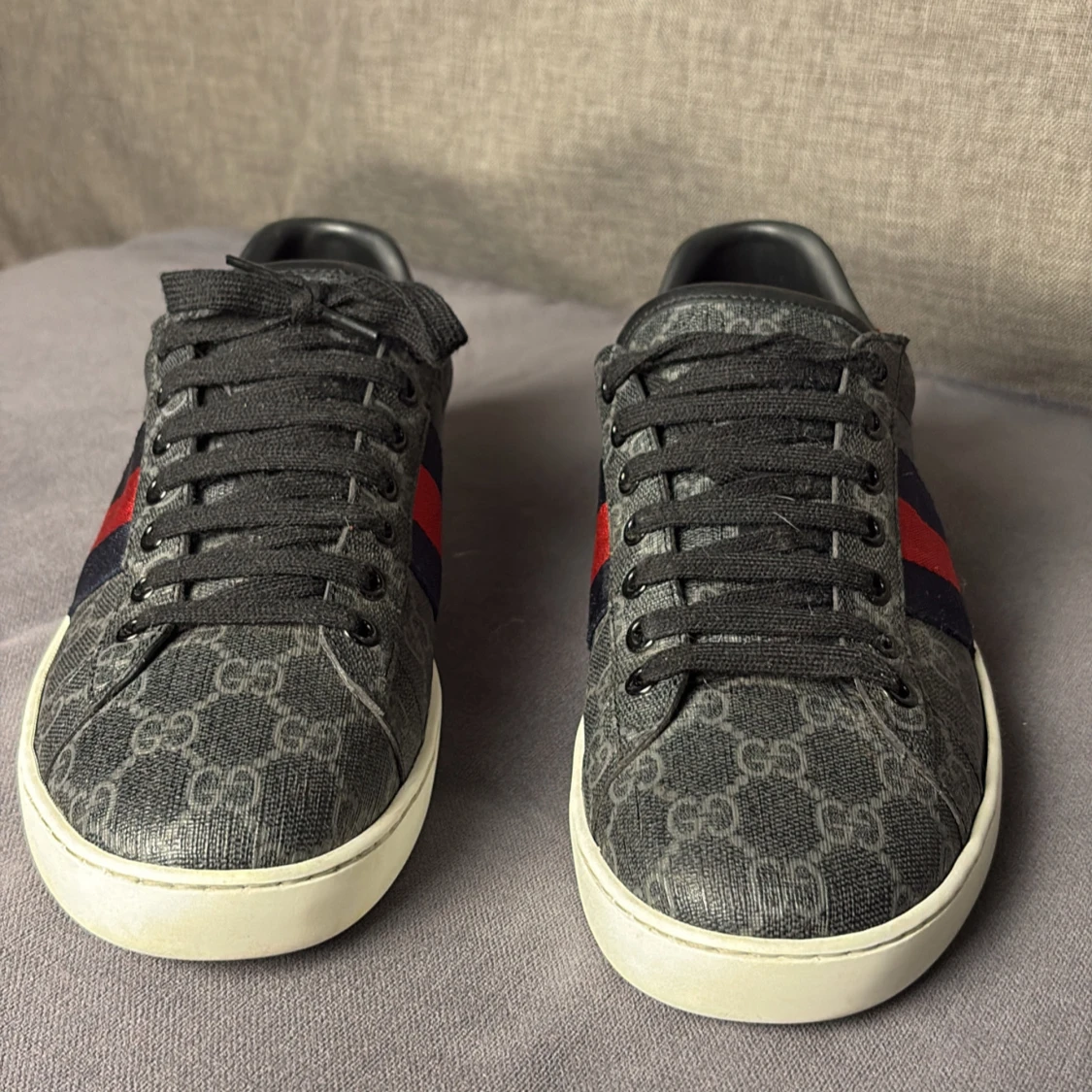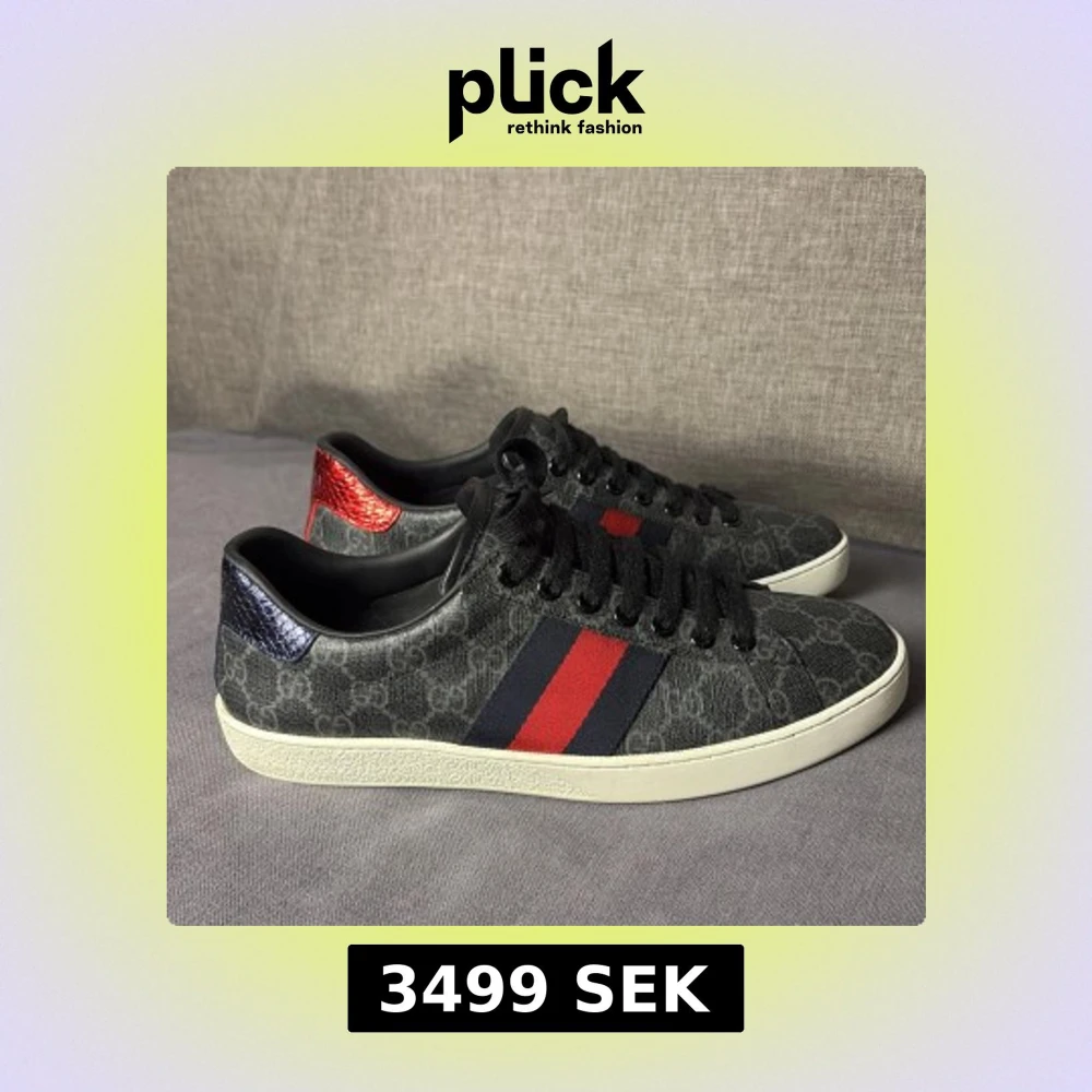 Gucci sneakers köpta på Versestiere, skorna är i extremt bra skick nästintill nyskick och har använts i cirka fem användningsområden. Lappar finns somsagt kvar inuti skorn som syns på bild nummer tre och därav priset!