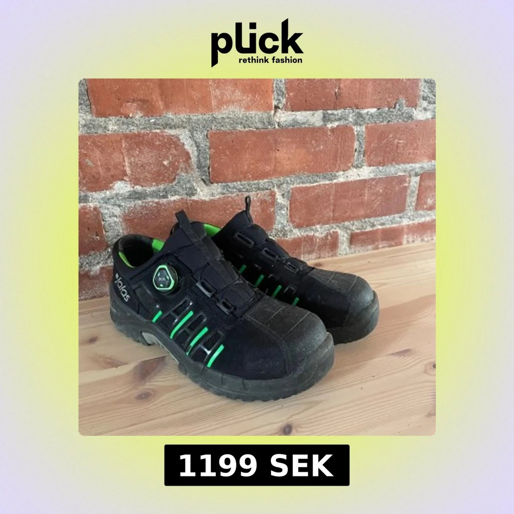 Säljer ett par svarta Jalas sneakers med gröna detaljer och BOA-snörning. Skorna har robust sula, rund tå och insida i grått och grönt. Perfekta för dig som vill ha en grym sko som är snygg och grym att arbeta med. Märke och storlek syns tydligt på insidan.