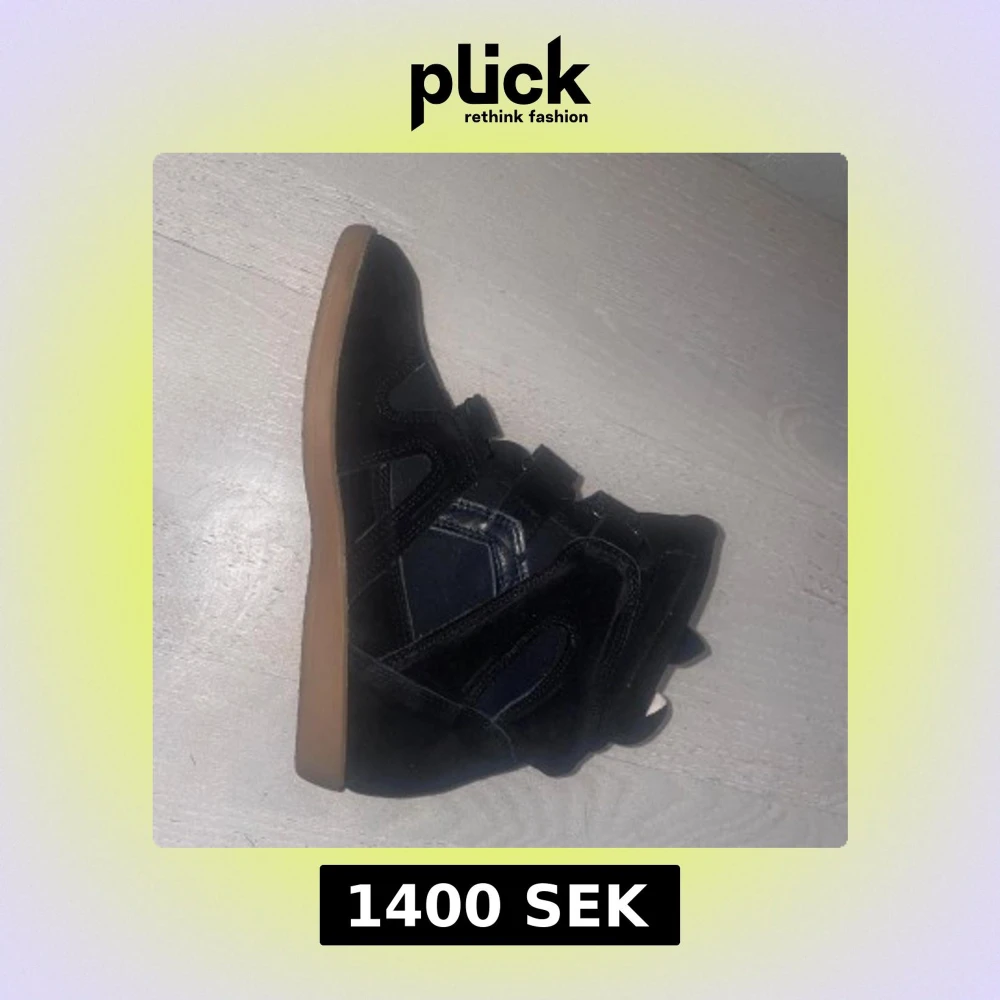 Snygga svarta sneakers med högt skaft och coola kardborreband. Skorna har en mix av mocka och syntet, samt en kontrasterande ljusbrun sula. Den är i storlek 42 men liten i storlek sulan är 26,5 cm. De är inte de äkta isabel marant men skulle påstå att de är identiska. Helt nya och oanvända säljer pgd av att de är för små. Skriv om ni vill ha fler bilder eller om ni har ytterligare frågor💗💗