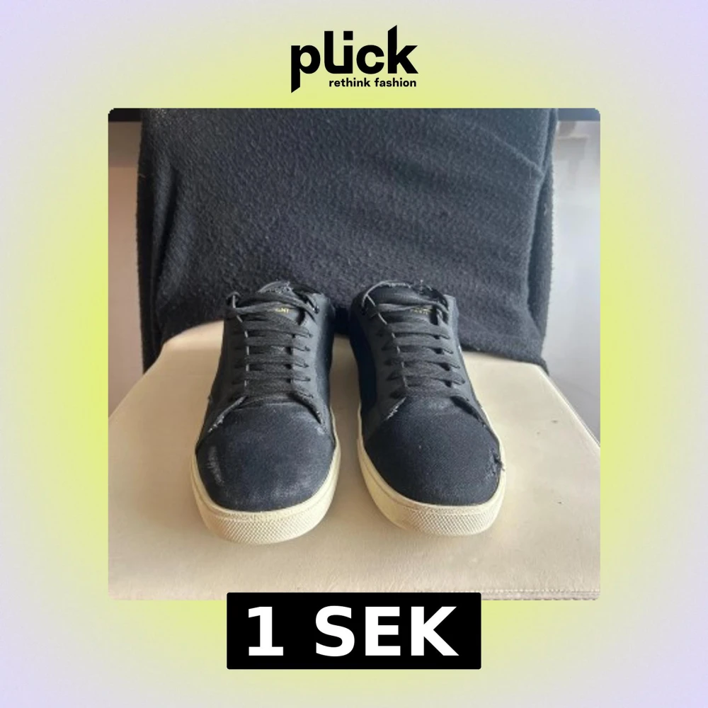 Säljer ett par svarta sneakers med klassisk design och vit platt sula. Skorna har snörning och rund tå, vilket gör dem enkla att matcha till olika outfits. Perfekta för dig som gillar en stilren och enkel look. Storlek 42/43