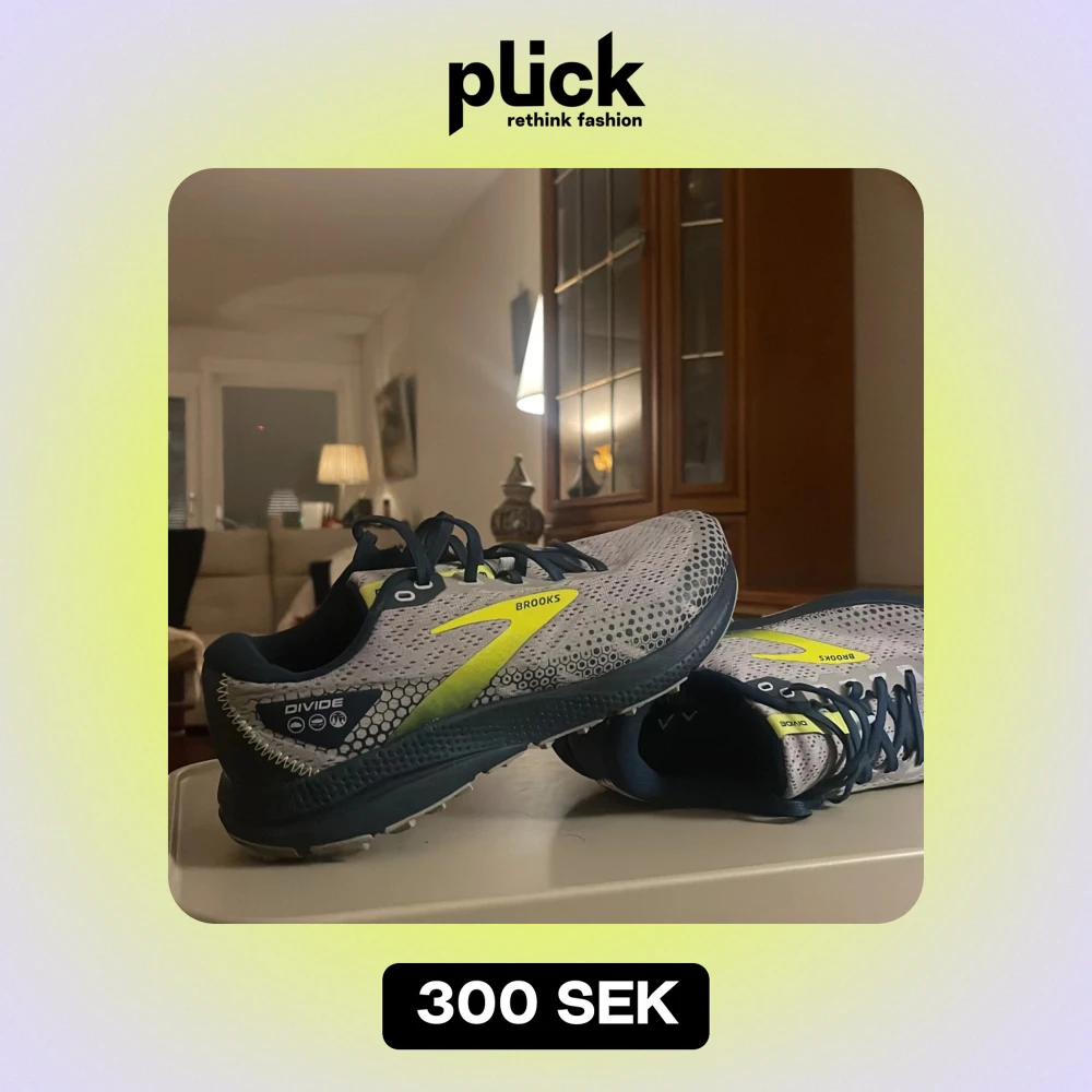 Säljer ett par Brooks Divide löparskor i grått och blått med neongula detaljer. Skorna har en robust sula och snörning för bra passform. Perfekta för löpning och träning, med en stilren design som funkar både i skogen och på stan.