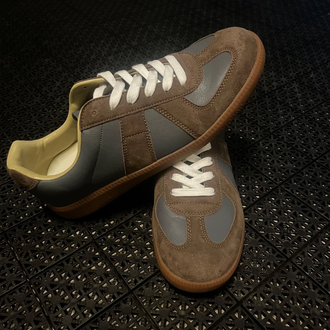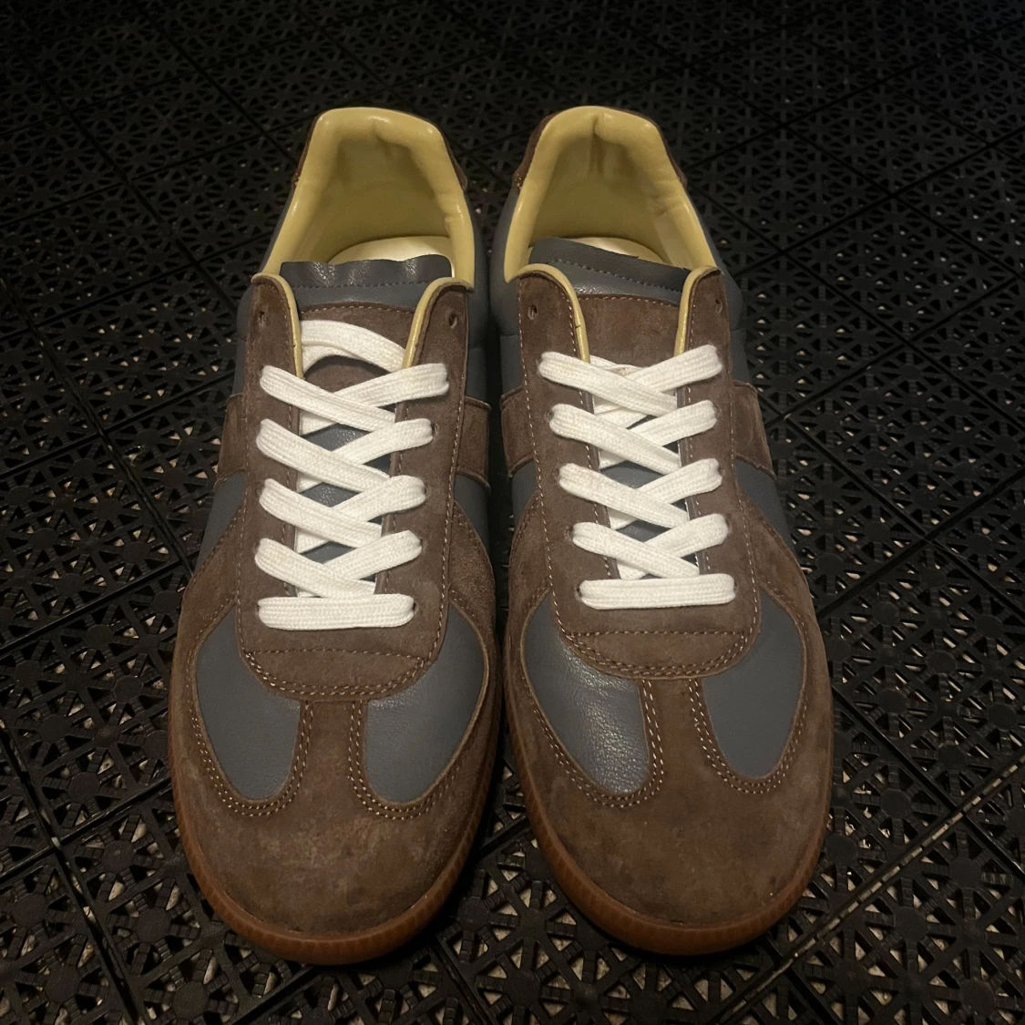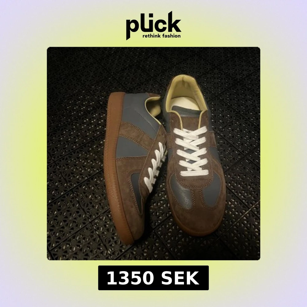 Snygga sneakers i en mix av brunt mocka och blått skinn, med vita snören och gummisula. Klassisk retrostil med rund tå och låg profil. Perfekta för dig som gillar stilrena och tidlösa sneakers med en twist. Helt nya andvända 1 gång. Storlek 43 men passar bättre på folk som har storlek 42. Obs. Det är inte maison margellas