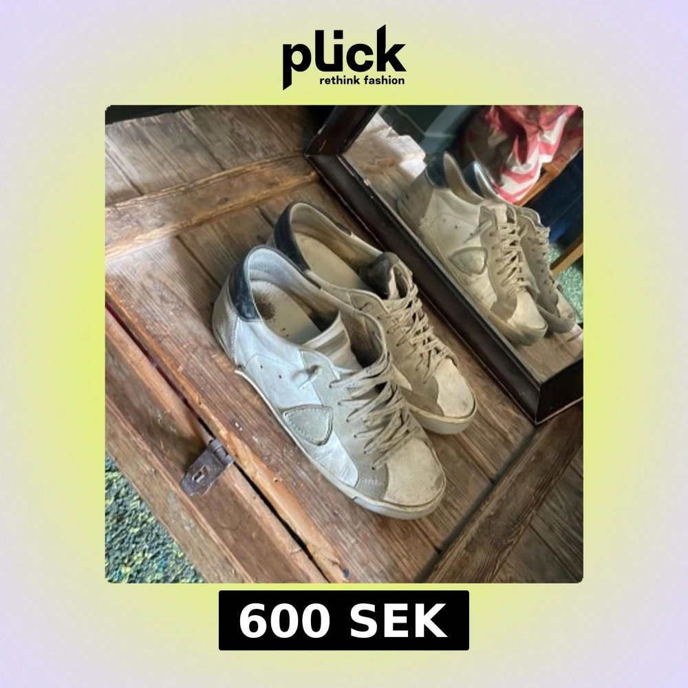 Säljer ett par vita sneakers från Phillipe model med svarta detaljer på hälen. Skorna har snörning och en platt sula. Perfekta för en avslappnad och trendig stil. Ganska slitna som ni ser och därav priset.