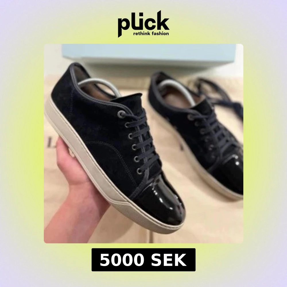 Snygga svarta sneakers med en kombination av mocka och lackdetaljer. Skorna har en vit sula och klassisk snörning. Perfekta för en stilren look.
