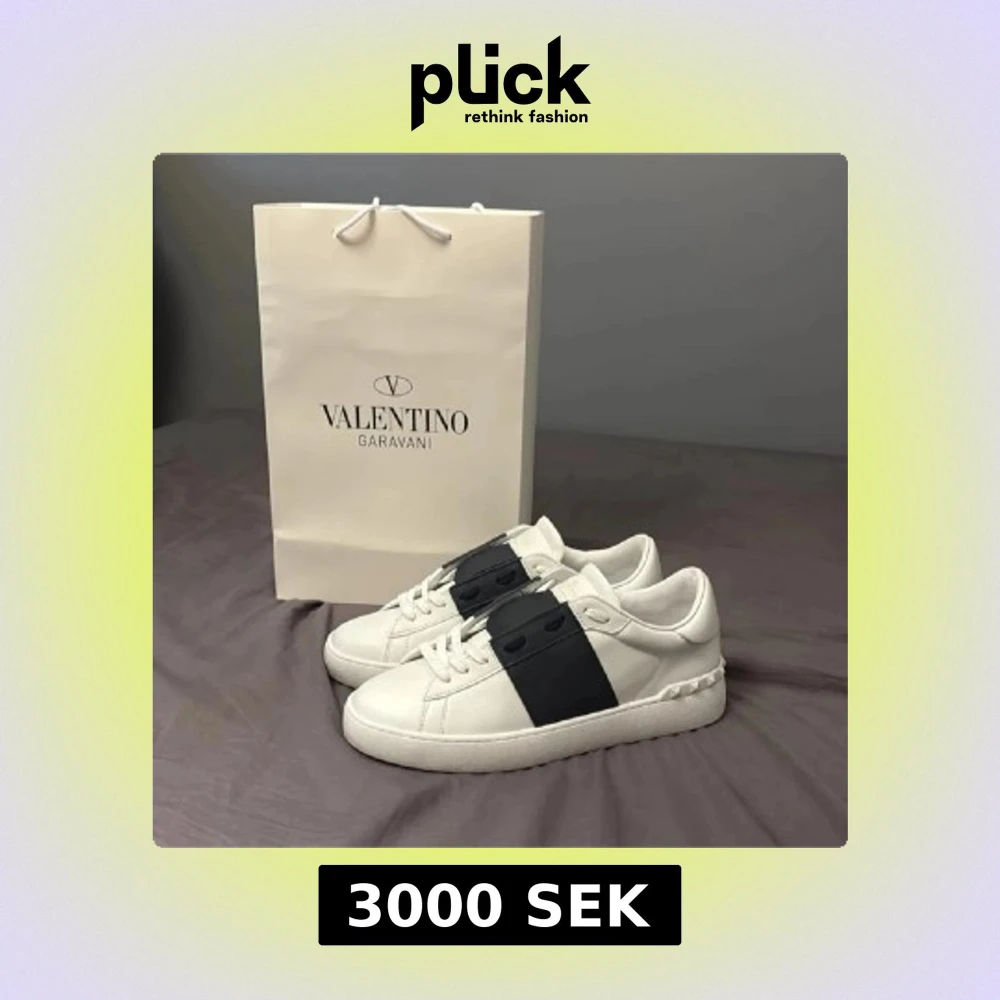 Säljer ett par vita Valentino Garavani Open sneakers med en bred svart rem över mitten. Skorna har rund tå, platt sula och klassisk snörning. Perfekta för dig som gillar stilrena och exklusiva sneakers. Kan gå ner i pris för snabb affär. Kvitto finns. Skriv om du undrar något