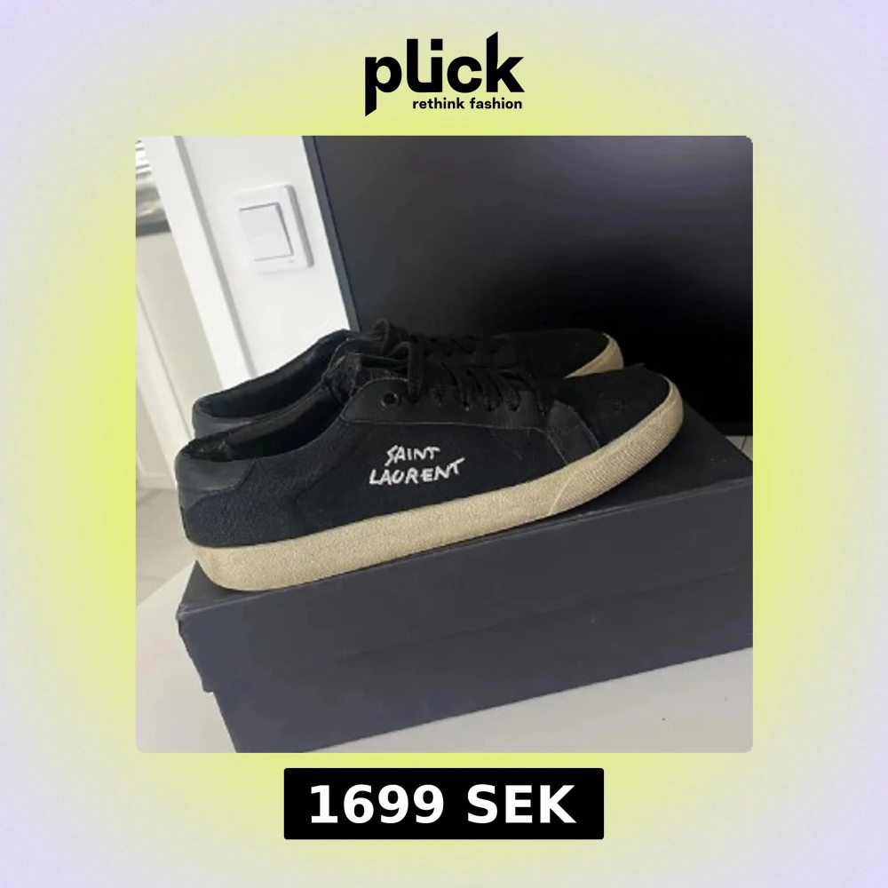 Svarta sneakers från Saint Laurent med vit broderad logga på sidan. Skorna har svart snörning, rund tå och beige platt gummisula. Perfekta för dig som gillar en clean och stilren look med en touch av lyx. Skorna är storlek 42 och passar även i 43. Mer bilder finns att kolla på. Fraktar samma dag som köp!! Här av er vid frågor eller funderingar. Kan gå ner i pris vid snabb affär!!