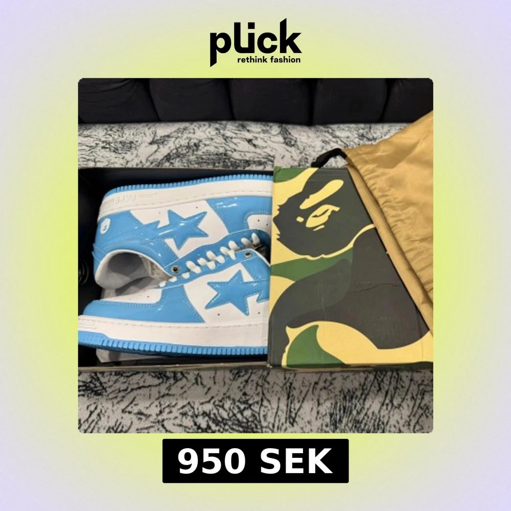 Säljer ett par BAPE STA sneakers i en fräsch blå och vit färgkombination. Skorna har en glansig finish, klassisk stjärndetalj på sidan och vit snörning. Kommer i originalkartong med camo-mönster. Perfekt för dig som vill sticka ut med streetwear.