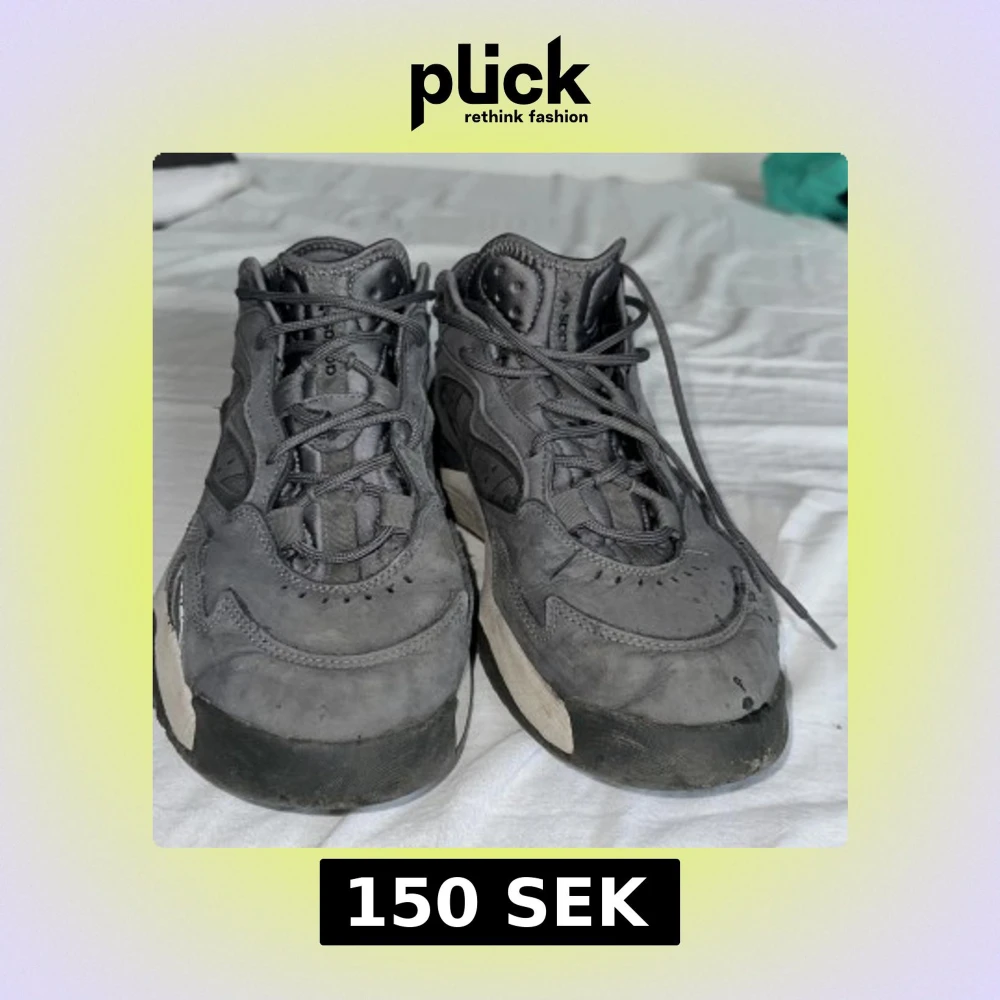 Säljer ett par grå adidas sneakers med coola detaljer och svart-vit sula. Skorna har snörning, rund tå och är tillverkade i en mix av syntet och mocka. Perfekta för dig som gillar streetstyle och vill ha en unik look. De är lite smutsiga men kan tvätta 43 1/3. Lite mjukare vid hälen på vänsterfoten
